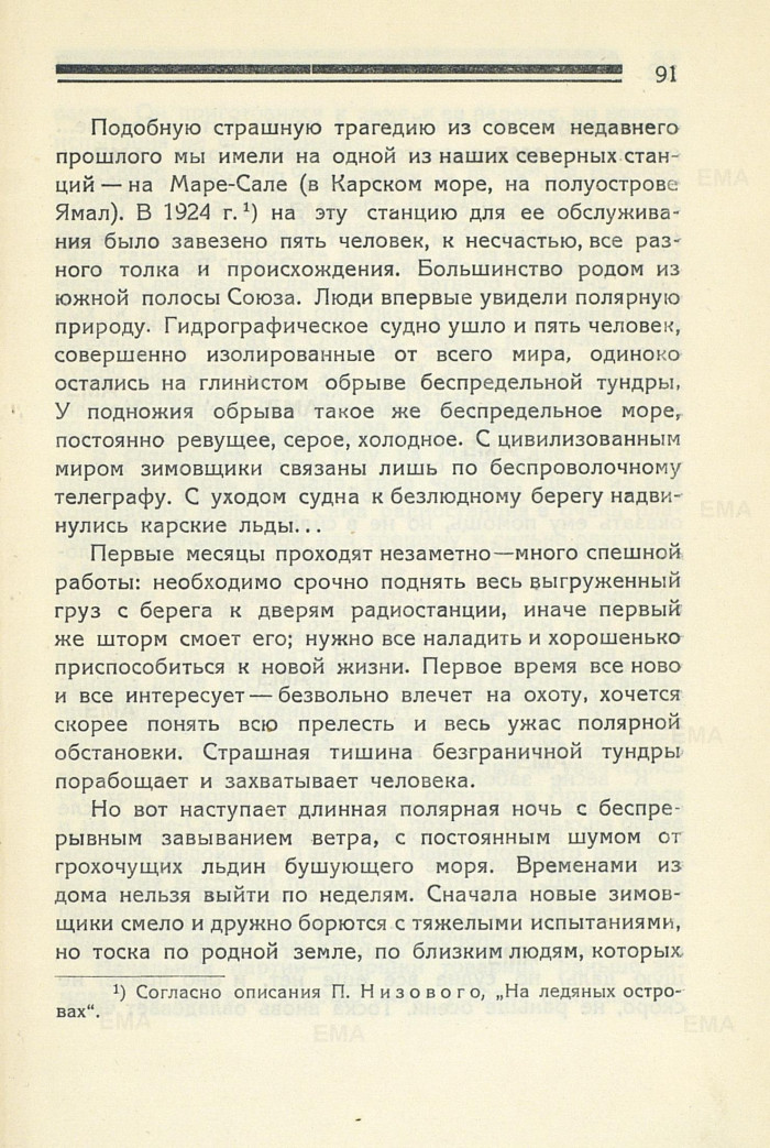 Подобную страшную трагедию из совсем недавнего прошлого мы имели на одной из наших северных станций — на Маре-Сале (в Карском море, на полуострове Ямал). В 1924 г.[37] на эту станцию для ее обслуживания было завезено пять человек, к несчастью, все разного толка и происхождения. Большинство родом из южной полосы Союза. Люди впервые увидели полярную природу. Гидрографическое судно ушло и пять человек, совершенно изолированные от всего мира, одиноко остались на глинистом обрыве беспредельной тундры, У подножия обрыва такое же беспредельное море, постоянно ревущее, серое, холодное. С цивилизованным миром зимовщики связаны лишь по беспроволочному телеграфу. С уходом судна к безлюдному берегу надвинулись карские льды…