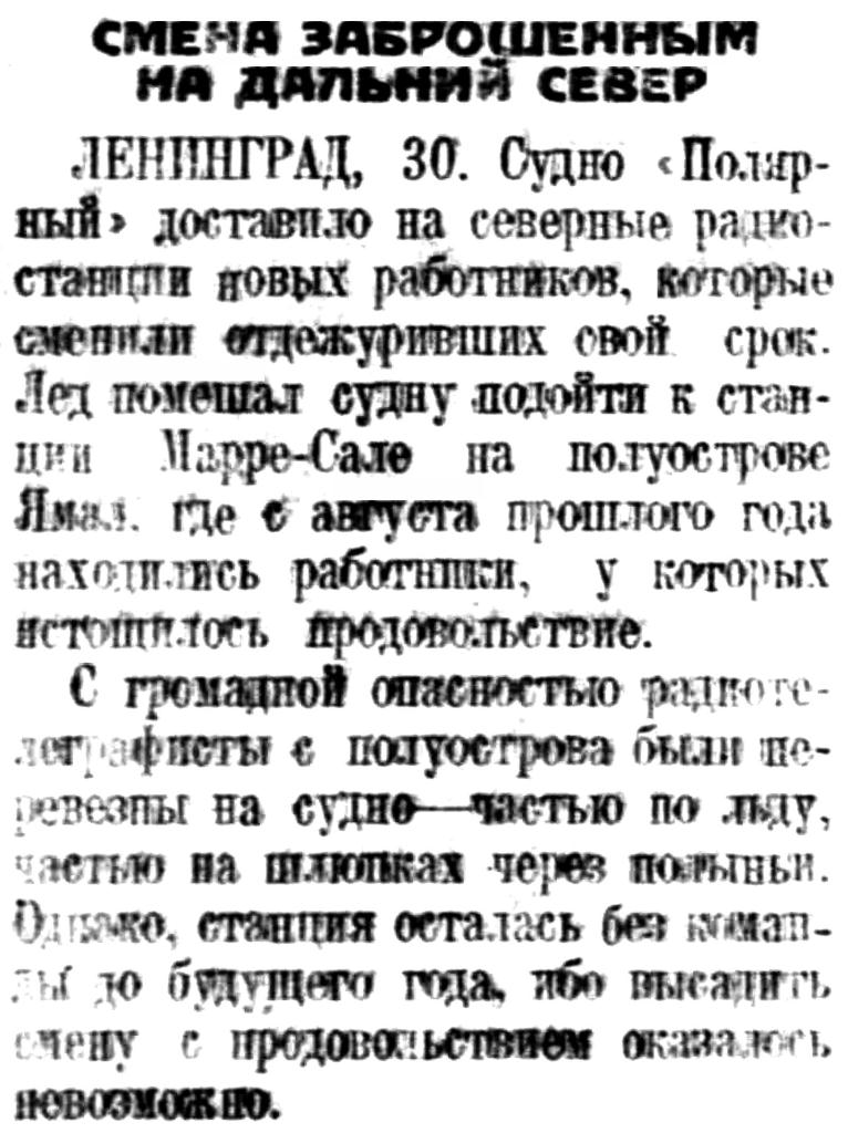 ЛЕНИНГРАД, 30. Судно "Полярный" доставило на северные радиостанции новых работников, которые сменили отдежуривших свой срок. Лед помешал судну подойти к станции Марре-Сале на полуострове Ямал, где с августа прошлого года находились работники, у которых истощилось продовольствие.
