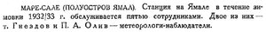 МАРЕ-САЛЕ (ПОЛУОСТРОВ ЯМАЛ). Станция на Ямале в течение зимовки 1932/33 г. обслуживается пятью сотрудниками. Двое из них — т. Гнездов и П. А. Олив — метеорологи-наблюдатели.