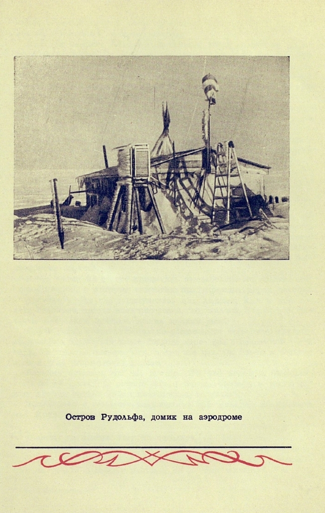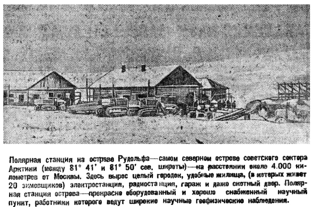 Полярная станция на острове Рудольфа — самом северном острове советского сектора Арктики (между 81° 41′ и 81° 50′ сев. широты) — на расстоянии около 4. 000 километров от Москвы. Здесь вырос целый городок, удобные жилища, (в которых живет 20 зимовщиков) электростанция, радиостанция, гараж и даже скотный двор. Полярная станция острова — прекрасно оборудованный и хорошо снабженный научный пункт, работники которого ведут широкие научные геофизические наблюдения.