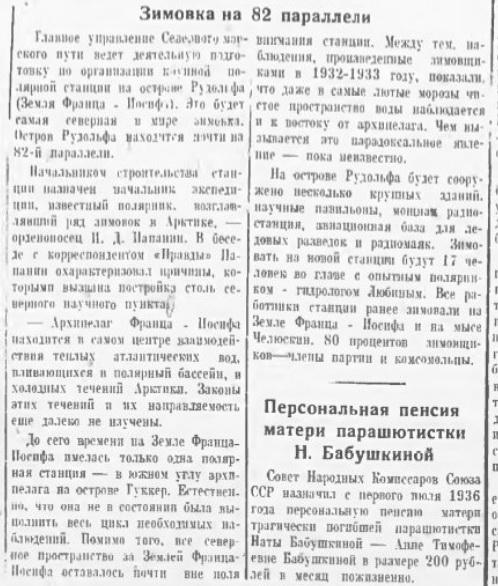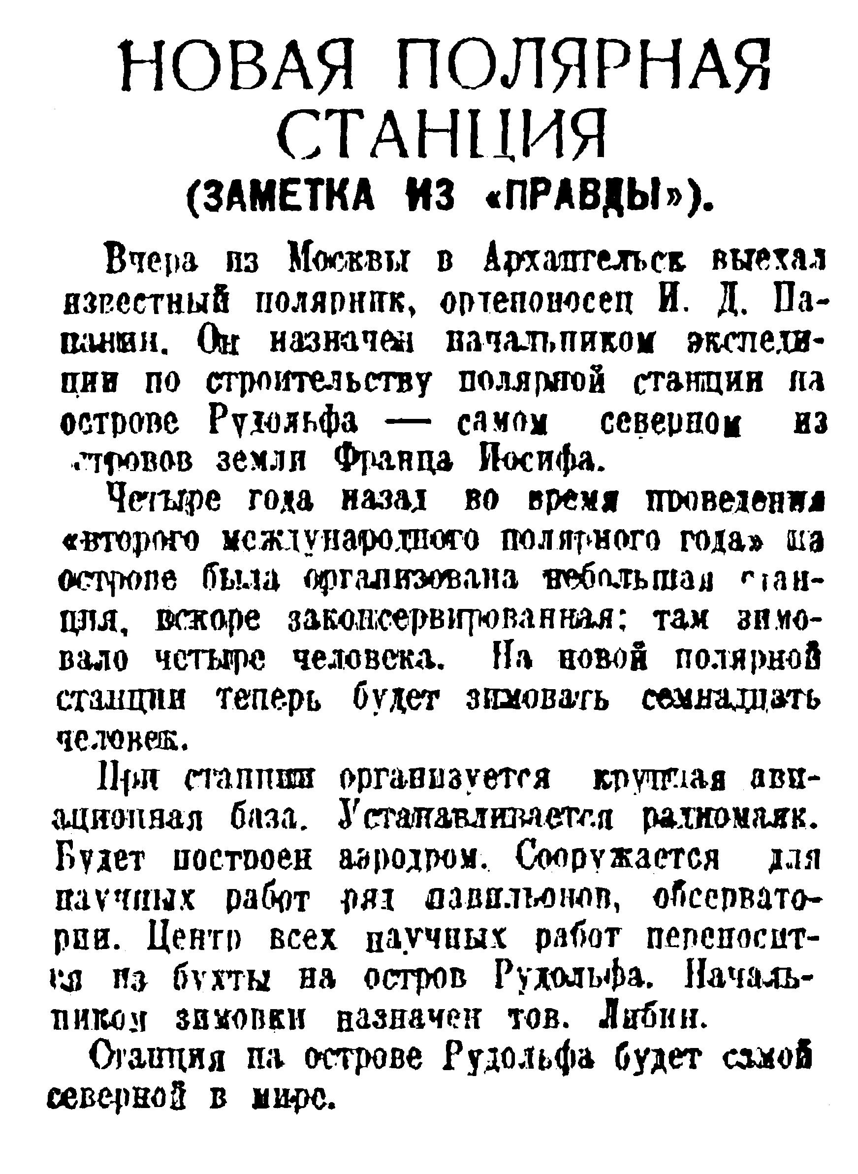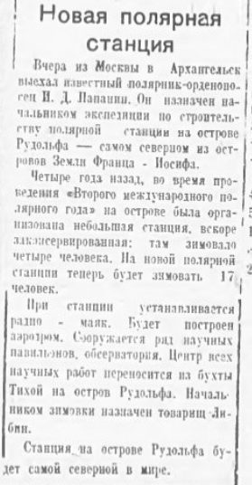 Вчера из Москвы в Архангельск, выехал известный полярник, орденоносец И. Д. Папанин. Он назначен начальником экспедиции по строительству полярной станции на острове Рудольфа — самом северном из остовов земли Франца Иосифа.