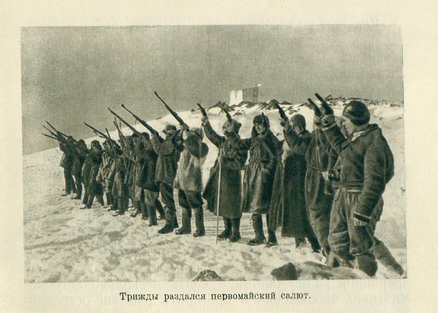 Когда отзвучали краткие, взволнованные речи, мы подняли винтовки, карабины, ракетные пистолеты, и на безмолвных берегах самой северной советской земли трижды раздался первомайский салют. В небе, на фоне белых облаков, растеклись желтые и розовые пятна взорвавшихся ракет.