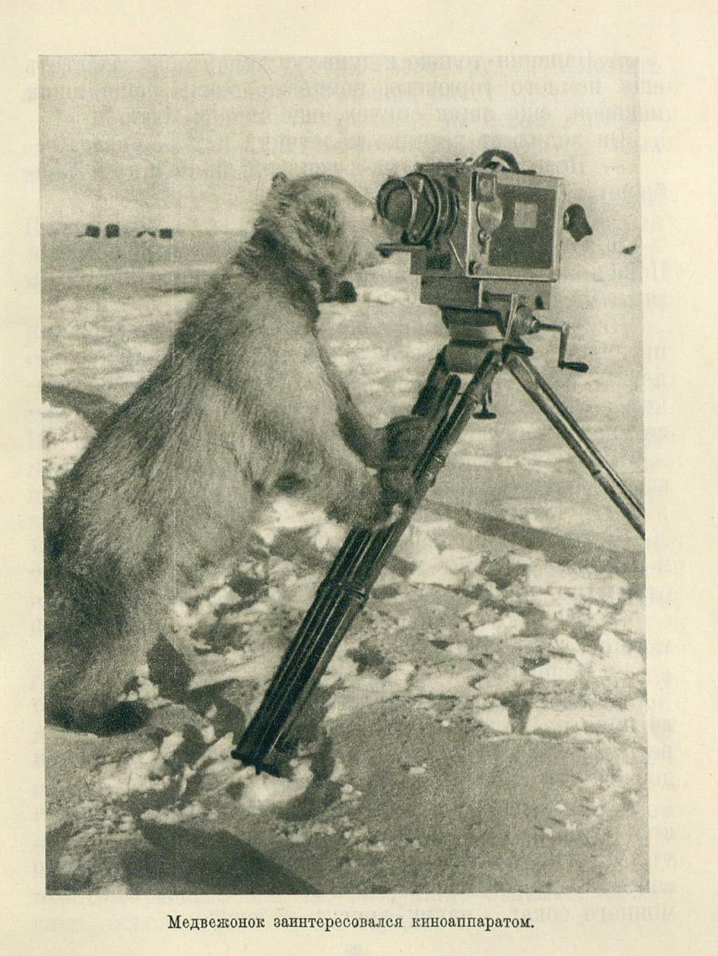 Несколько дней назад эта медведица забрела на станцию. Зимовщики убили ее и поставили около дома. Через несколько минут мороз сковал убитого зверя в такой позе, какую старались придать ему зимовщики.