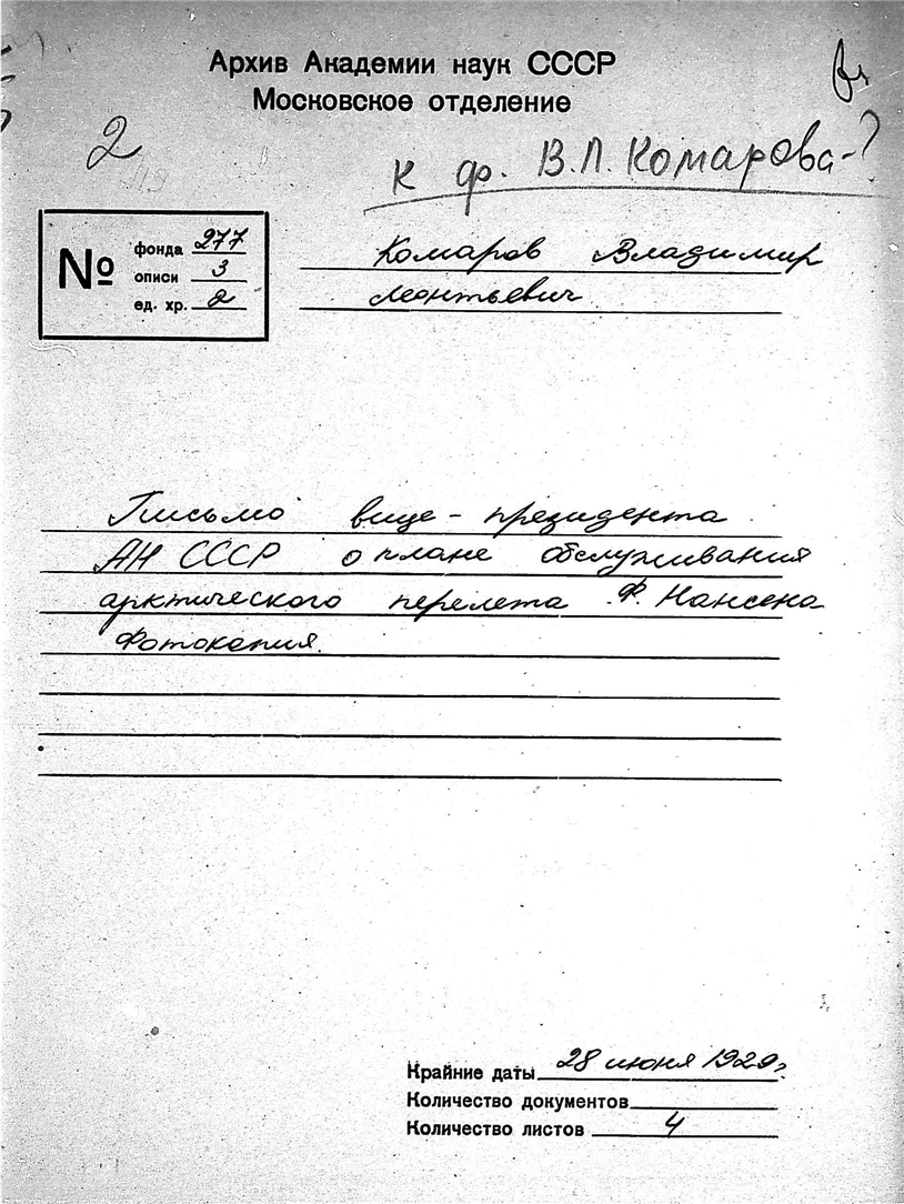 Архив РАН. Личный архив В. Л. Комарова
