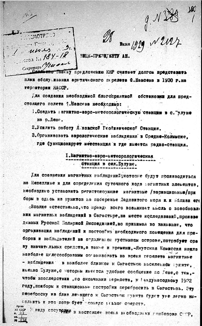 Комаров Владимир Леонтьевич. Письмо вице-президента АН СССР о плане обслуживания арктического перелета Ф. Нансена.