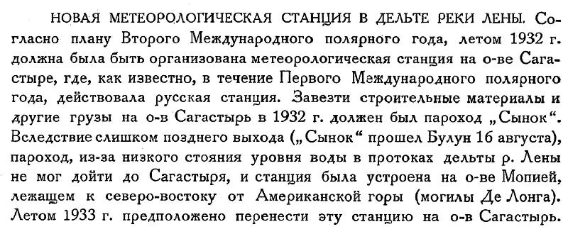 НОВАЯ МЕТЕОРОЛОГИЧЕСКАЯ СТАНЦИЯ В ДЕЛЬТЕ РЕКИ ЛЕНЫ. Согласно плану Второго Международного полярного года, летом 1932 г. должна была быть организована метеорологическая станция на о-ве Сагастыре, где, как известно, в течение Первого Международного полярного года, действовала русская станция. Завезти строительные материалы и другие грузы на о-в Сагастырь в 1932 г. должен был пароход „Сынок". Вследствие слишком позднего выхода („Сынок" прошел Булун 16 августа), пароход, из-за низкого стояния уровня воды в протоках дельты р. Лены не мог дойти до Сагастыря, и станция была устроена на о-ве Мопией, лежащем к северо-востоку от Американской горы (могилы Де Лонга). Летом 1933 г. предположено перенести эту станцию на о-в Сагастырь.