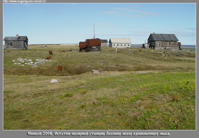 Мы посетили район мыса 31 июля 2008 г., в этот день мы работали на береговых обрывах к юго-востоку от полярной станции. Печальное впечатление производит брошенное поселение. Во всех домиках выбиты стекла, только у одного окна затянуты полиэтиленовой пленкой. У разбитой радиостанции - пачка телеграмм 1992-1994 гг из Диксона и в Диксон - приняли топливо, получили продукты, просим прислать запасные детали... и т.д.