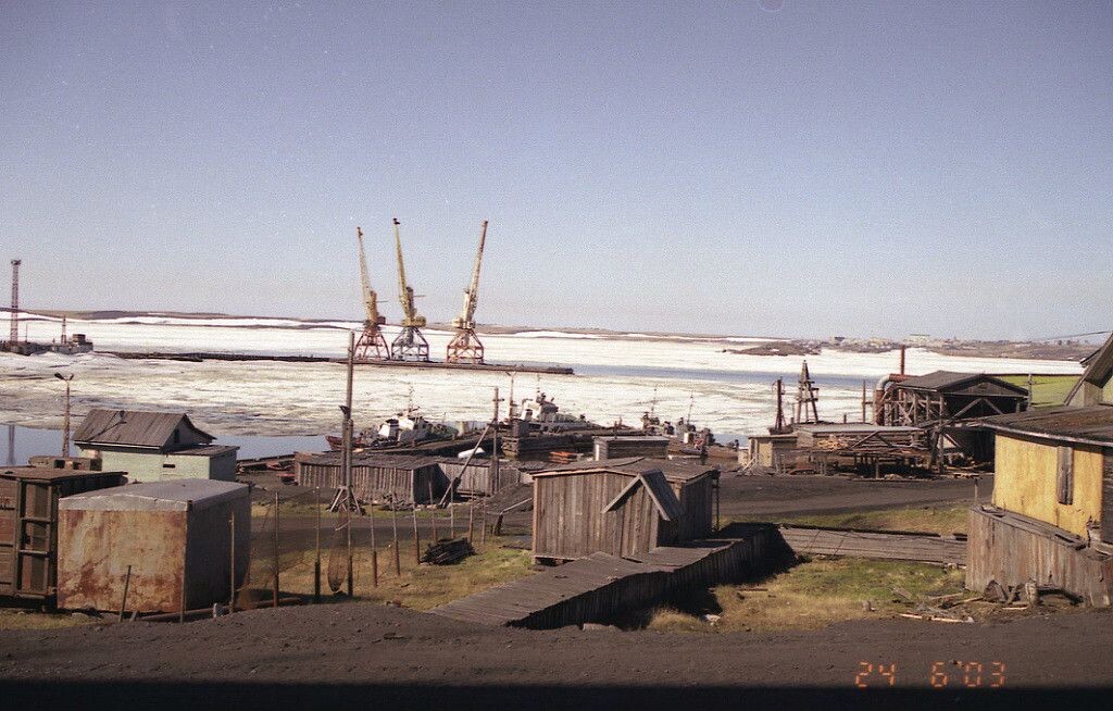 За кранами на горизонте - гавань Диксон. Правее по горизонту- посёлок Новый Диксон.