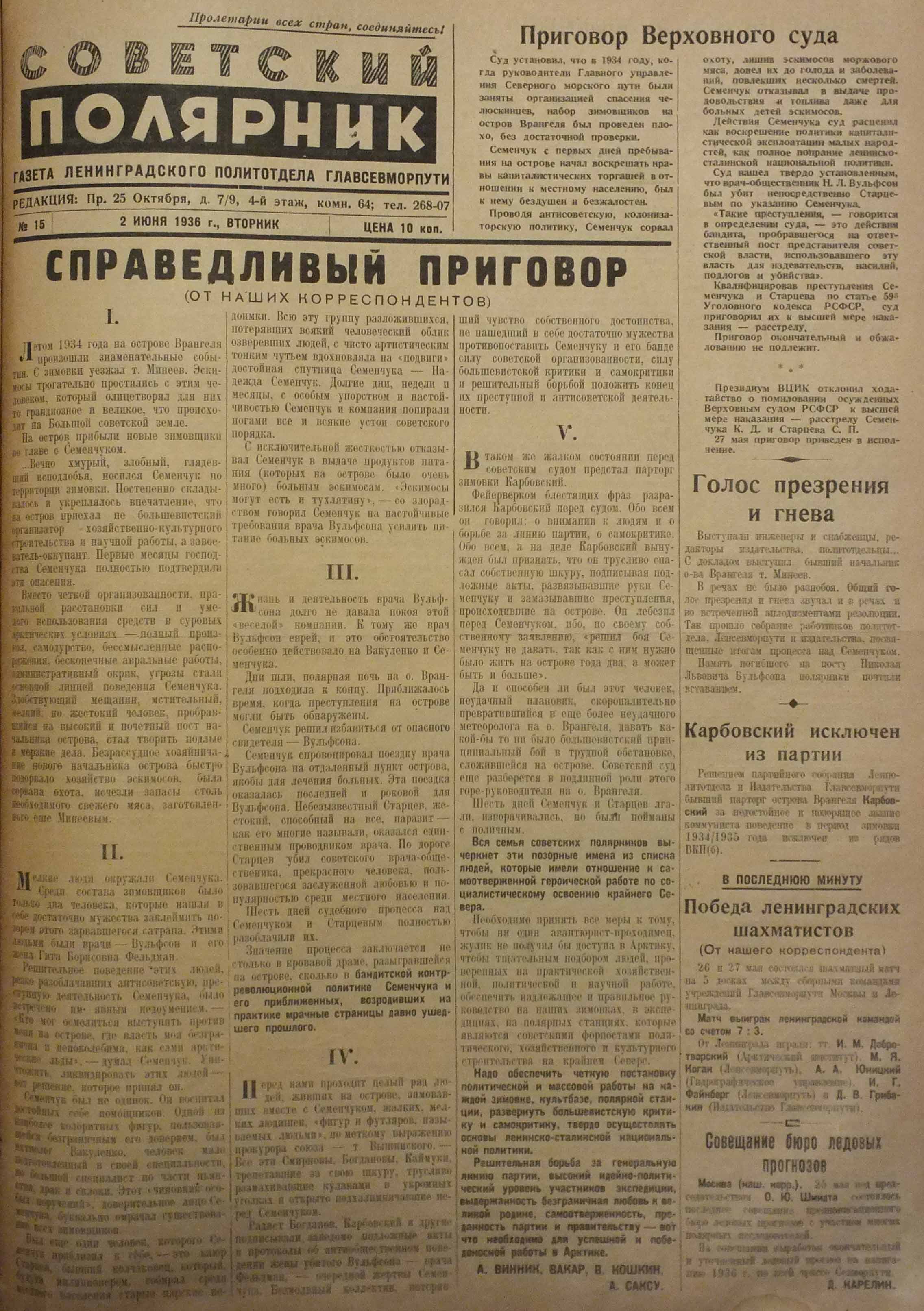 Пять часов — рекордно долго продолжалась обвинительная речь прокурора СССР Вышинского на процессе по делу об убийстве врача Николая Вульфсона, погибшего во время зимовки на острове Врангеля в декабре 1934 года. Беспрецедентная продолжительность выступления обвинителя объяснялась просто. Обвиняемые — начальник зимовки Константин Семенчук и каюр Степан Старцев — свою вину полностью отрицали. А все обвинение строилось на предсмертной записке покойного, показаниях свидетелей и догадках следствия. Однако выступления участников процесса, как и показания подсудимых и свидетелей, большого значения не имели, поскольку еще до начала суда приговор вынесла самая высокая инстанция — политбюро ЦК ВКП(б).