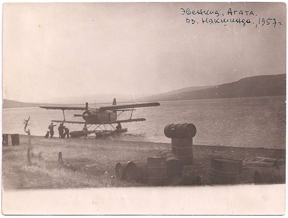 Из Игарки на самолёте АН-2 нас доставили на ледяную поверхность озера Някшинда. Это громадное озеро находилось во впадине, окружённой горами с чередующимися вершинами-гольцами. Недалеко от места посадки мы увидели несколько деревянных домиков без окон и дверей. Это и был посёлок Агата.