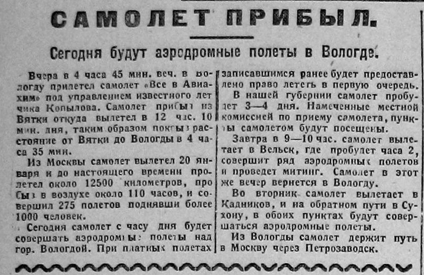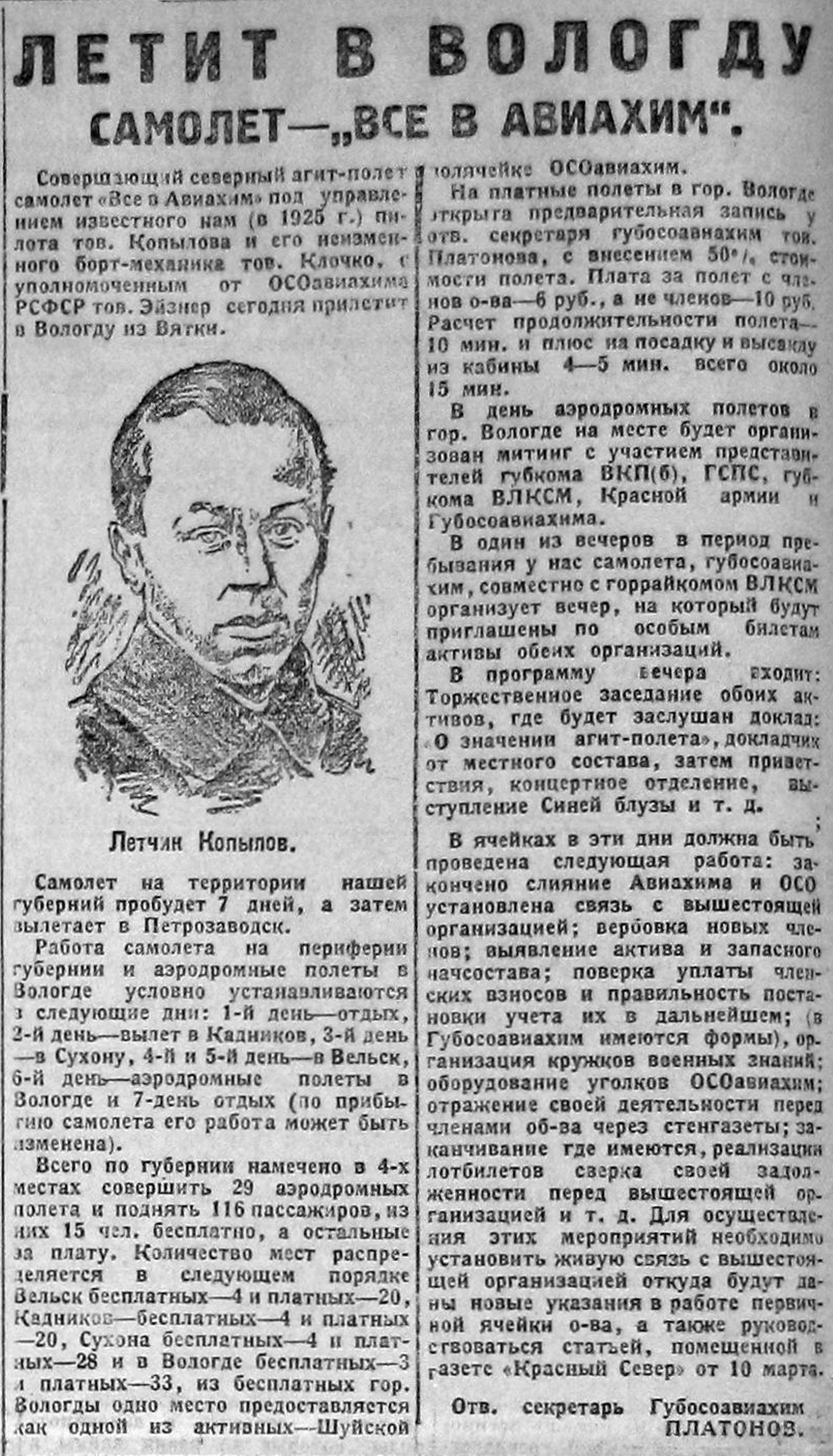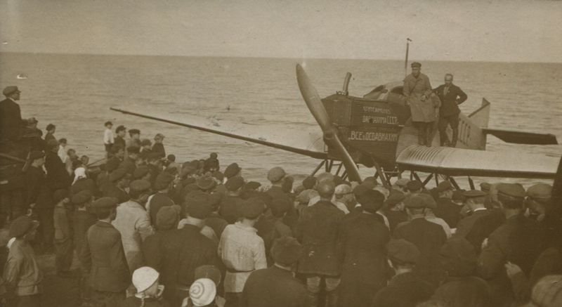 В фондах Белозерского музея хранится коллекция фотографий самодеятельного фотографа г. Белозерска Василия Васильевича Кичагова. Он оставил нам замечательную фотохронику Белозерья 1920 — 1930-х гг. В условиях дефицита фотобумаги, пленки, кризиса, который переживало фотодело в СССР, В.В. Кичагов сумел отразить жизнь города во всех ее проявлениях. Среди прочих в его коллекции находим фотографии с изображением гидросамолета, который в сентябре 1928 года приземлился на Белое озеро в районе города Белозерска. На борту самолета крупным текстом надпись: «Агитсамолет ОСОАВИАХИМА СССР — все в ОСОАВИАХИМ». Для населения города это было событие. Судя по датам, указанным на фотографиях, самолет в течение четырех дней с 12 по 15 сентября находился в Белозерске. При приземлении самолет врезался в берег, один из поплавков слетел со стоек шасси. На фотографии мы видим, как группа мужчин старается приподнять корпус самолета, чтобы закрепить слетевший поплавок. Все, от мала до велика, шли на озеро, чтобы посмотреть на чудо техники. По рассказам очевидцев, желающих-смельчаков на самолете катали над озером. Это была своего рода наглядная агитация.