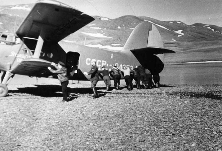 Таймыр, лето 1961 года. Полярная авиация помогает геологам. Садились на такие узкие полосы пригодного галечника, что для взлета приходилось вручную разворачивать самолёт \"носом на ветер\".