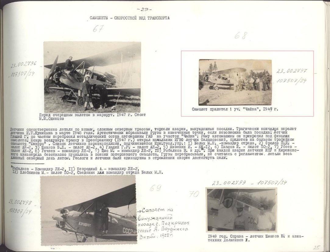 Летчики самоотверженно летали по новым, сложным северным трассам, терпели аварии, вынужденные посадки. Трагически кончился перелет летчика И.Т.Куницына в марте 1948 года. Артистически сбрасывали грузы в намеченные точки, если невозможна была посадка. Летчик Гладий Г.по частям перебросил металлический остов автомашины ГАЗ на участок «Чайка». Раму автомашины он прикрепил под фюзеляж самолета. Новую воздушную трассу в Преображенку (1947 г) открыл начальник ИГВФ летчик Фиалковский, прилетев на большом трофейном самолете «Юнкерс». Список летчиков аэроэкспедиции, подчинявшейся Иркутскому геологическому управлению: 1.) Белых М.Н. – командир отряда, 2.) Фролов П.Д.- пилот Ан-2, 3.) Шмаков Б.Л. – пилот Ан-2, 4.) Гладий Г.Р. – пилот Ан-2, 5.) Мизенин И. – пилот Як-12, 6.) Павлов И. – пилот По-2, 7.) Убеев пилот Ан-2, 8.) Унчеев – командир Ли-2, 9.) Цис М. – командир Ли-2, 10.) Рыбалков В. – командир Ли-2, 11.) Безродный А. – командир Ли-2, 12.) Хлебников М. - пилот По-2.