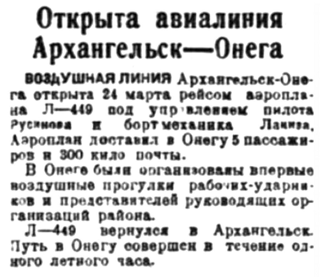 ВОЗДУШНАЯ ЛИНИЯ Архангельск - Онега открыта 24 марта рейсом аэроплана Л—449 под управлением пилота Русинова и бортмеханика Ла[циза?]. Аэроплан доставил в Онегу 5 пассажиров и 300 кило почты.