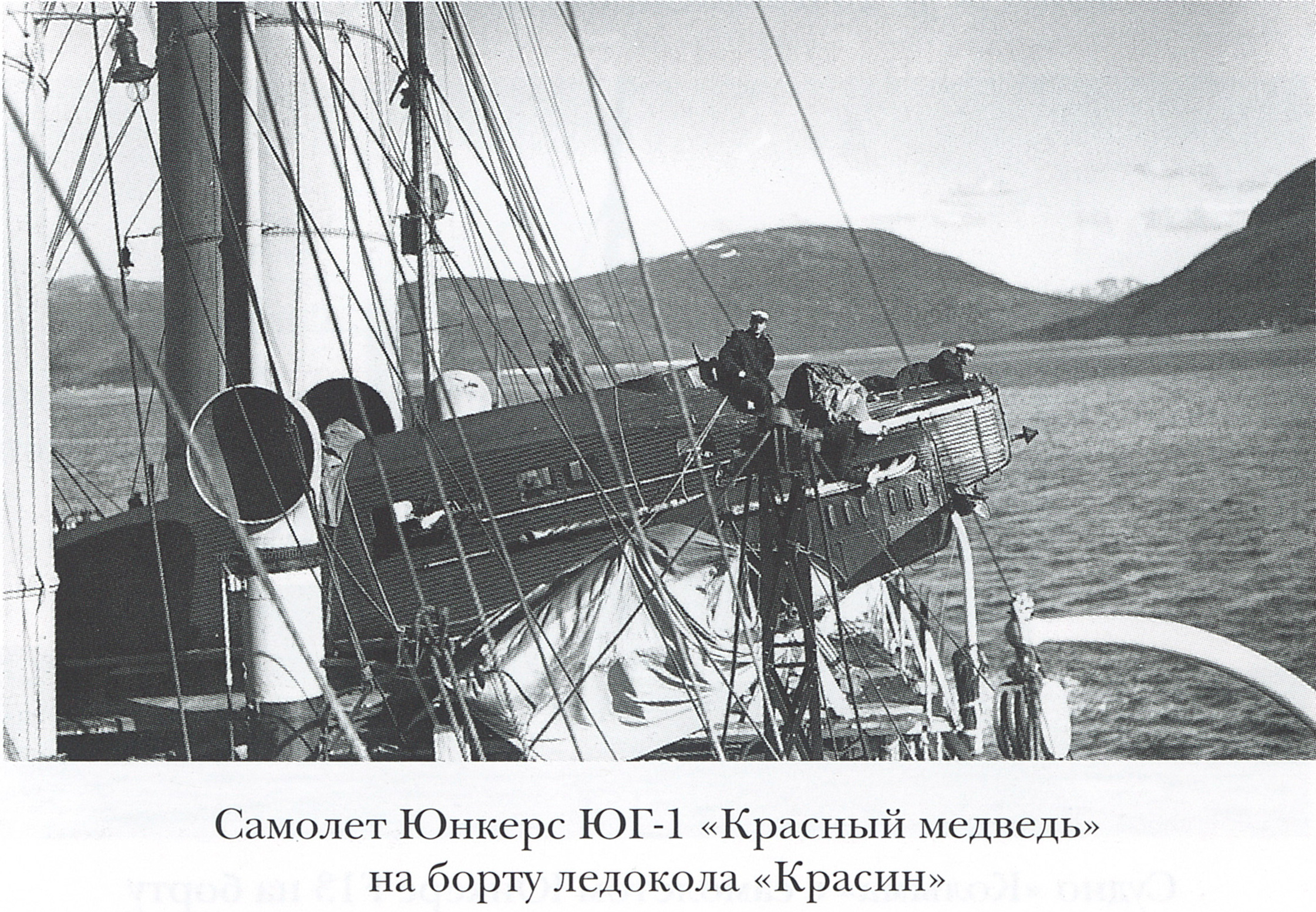 ..."29 мая 1928 года в Северном Ледовитом океане потерпел аварию и разбился дирижабль «Италия», на котором международная экспедиция совершала полет к Северному Полюсу.12 июня 1928 г. июня был организован советский «Комитет помощи Нобиле» под председательством Уншлихта. За трое суток был расконсервирован ледокол «Красин», погружены все необходимые припасы, взята на борт авиагруппа. 18 июня «Красин» вышел из Ленинградского порта. На борту находился самолет «Юнкерс» ЮГ-1. Самолет был получен со склада Балтийского флота за одни сутки до выхода ледокола. "Красного Медведя" - так назвали новый ЮГ-1, ещё не имевший бортового номера - собирали уже в море.