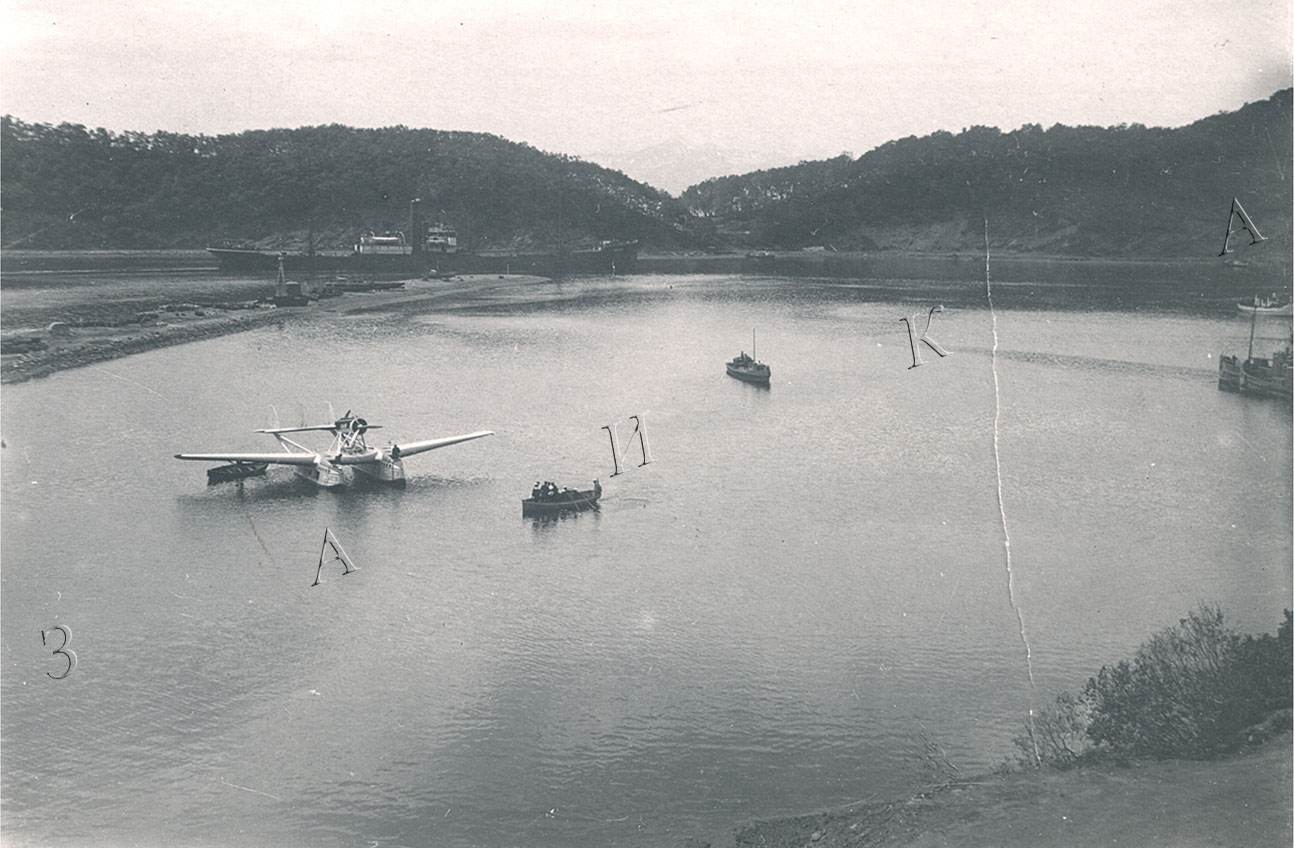В 12 часов 10 мин. 27 сентября на горизонте со стороны Советской гавани в воздухе появилась летящая точка. Она быстро приближалась и через несколько минут приняла очертание стрекозы. Блестящая в солнечных лучах, оглушающая город рокотом мотора, стрекоза оказалась мощным красавцем гидросамолетом "Савойя 55". Описав в воздухе два круга, "С 55" уверенно пошел на посадку и, взметая вокруг себя пыль морских брызг, закончил свой ныряющий бег по волнам возле устья речки Александровки.