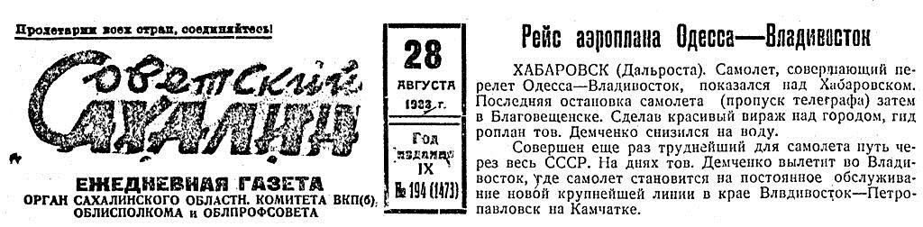 Советский Сахалин, 1933 № 194 (28, август) Рейс аэроплана Одесса-Владивосток.jpg