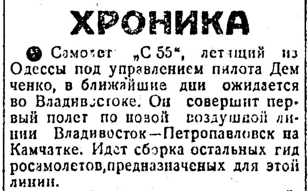 Самолет „С 55“, летящий из Одессы под управлением пилота Демченко, в ближайшие дни ожидается во Владивостоке. Он совершит первый полет по новой воздушной линии Владивосток — Петропавловск на Камчатке. Идет сборка остальных гидросамолетов, предназначенных для этой линии.