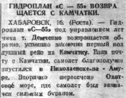 ХАБАРОВСК. 16. (Роста). — Гидроплан «С—55» под управлением летчика т. Демченко возвращается обратно, успешно закончив первый воздушный рейс на Камчатку. Взяв почту с Камчатки, самолет благополучно отпустился в Николаевске-на-Амуре. Вторично пересечено Охотское море, где самолет был зaхвачен сильным бураном.