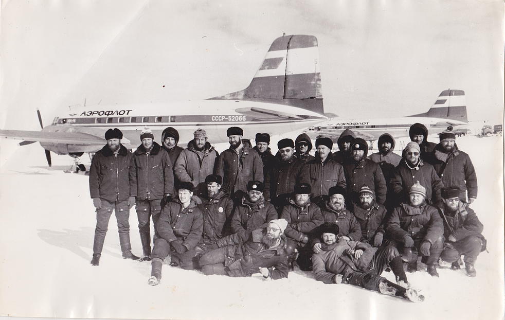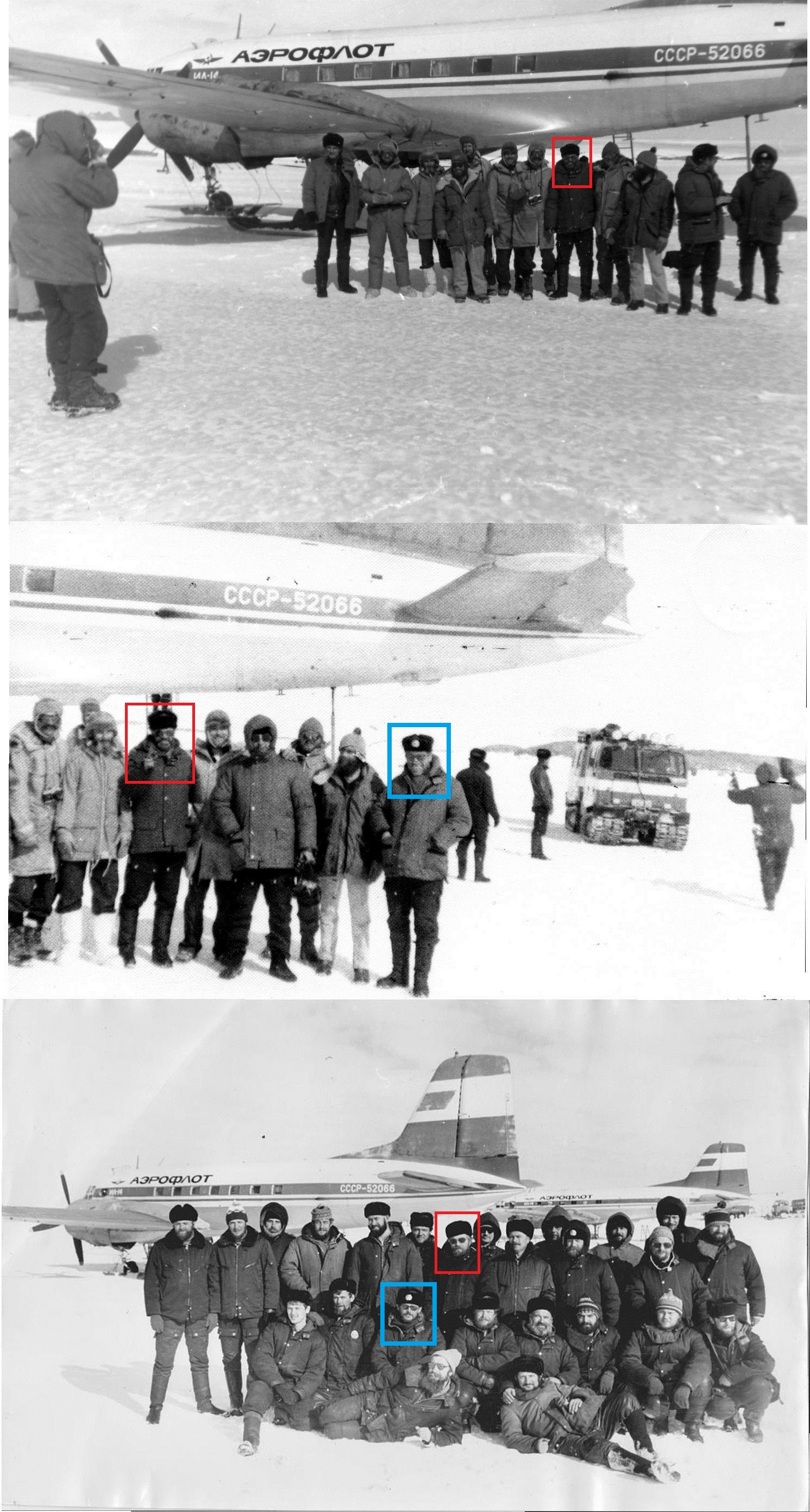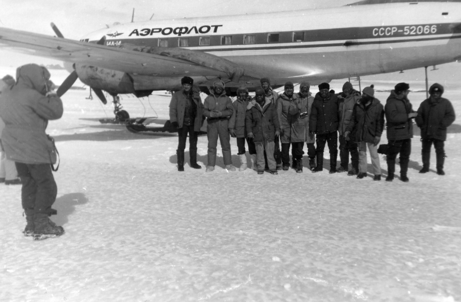 В центре снимка командир корабля Валерий Петрович Гамов, участник многих арктических и, как минимум, двух антарктических экспедиций, сын командира эскадрилии 1 ПАП 1 ПАД Петра Павловича Гамова, одного из немногих летчиков трассы, награжденных орденом Ленина за перегонку самолетов с Аляски.