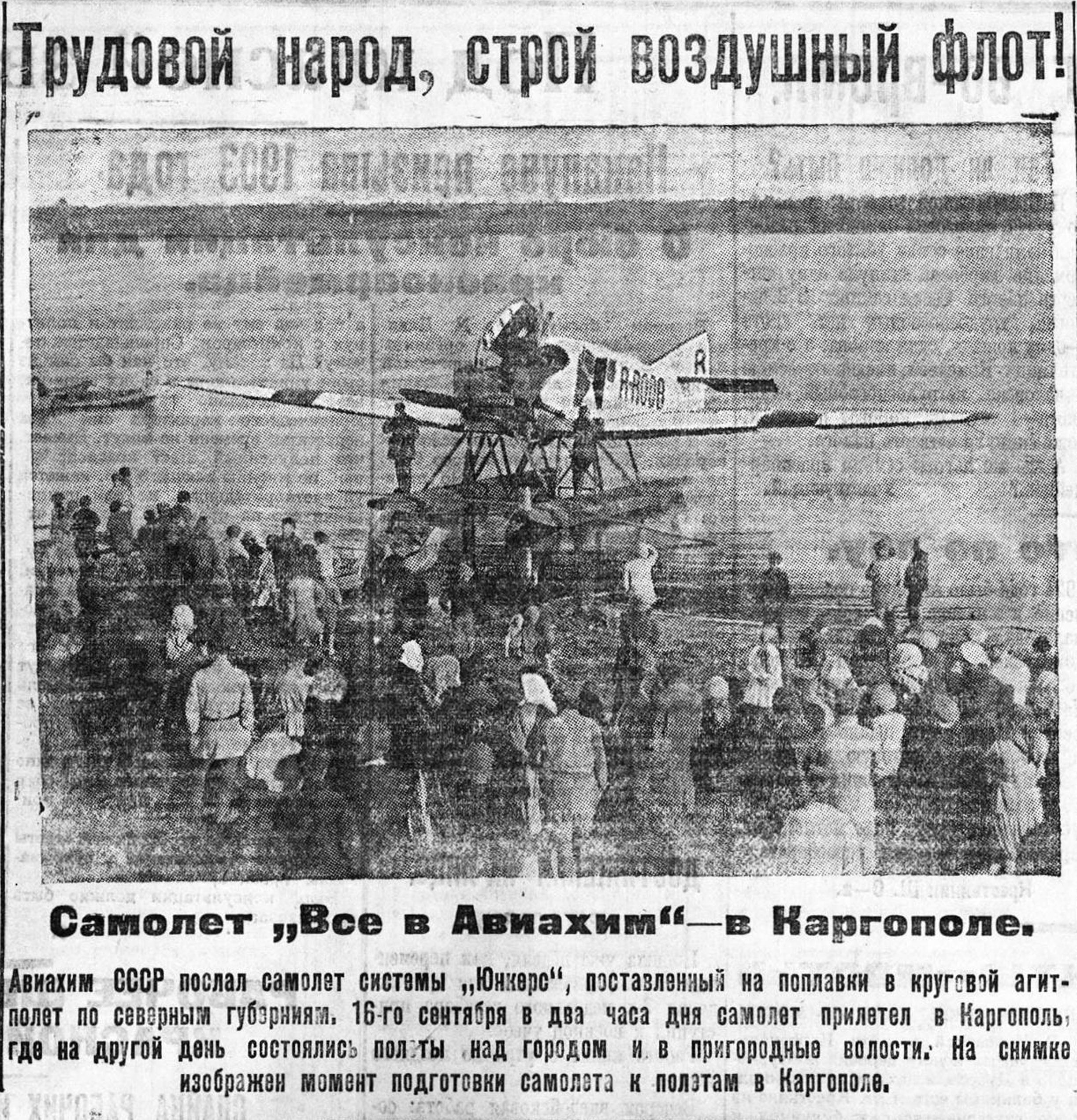 В фондах Белозерского музея хранится коллекция фотографий самодеятельного фотографа г. Белозерска Василия Васильевича Кичагова. Он оставил нам замечательную фотохронику Белозерья 1920 — 1930-х гг. В условиях дефицита фотобумаги, пленки, кризиса, который переживало фотодело в СССР, В.В. Кичагов сумел отразить жизнь города во всех ее проявлениях. Среди прочих в его коллекции находим фотографии с изображением гидросамолета, который в сентябре 1928 года приземлился на Белое озеро в районе города Белозерска. На борту самолета крупным текстом надпись: «Агитсамолет ОСОАВИАХИМА СССР — все в ОСОАВИАХИМ». Для населения города это было событие. Судя по датам, указанным на фотографиях, самолет в течение четырех дней с 12 по 15 сентября находился в Белозерске. При приземлении самолет врезался в берег, один из поплавков слетел со стоек шасси. На фотографии мы видим, как группа мужчин старается приподнять корпус самолета, чтобы закрепить слетевший поплавок. Все, от мала до велика, шли на озеро, чтобы посмотреть на чудо техники. По рассказам очевидцев, желающих-смельчаков на самолете катали над озером. Это была своего рода наглядная агитация.