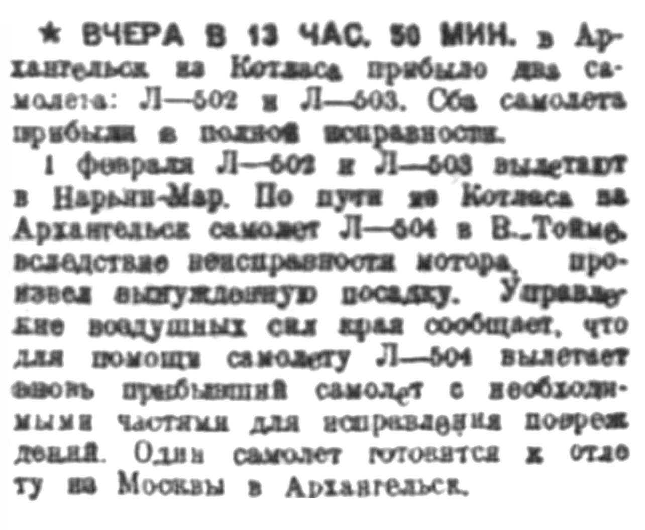 1 февраля Л—502 и Л—503 вылетают в Нарьян-Мар. По пути из Котласа на Архангельск самолет Л—504 в В-.Тойме, вследствие неисправности мотора, произвел вынужденную посадку. Управление воздушных сил края сообщает, что для помощи самолету Л—504 вылетает вновь прибывший самолет с необходимыми частями для исправления повреждений. Один самолет готовится к отлету из Москвы в Архангельск.