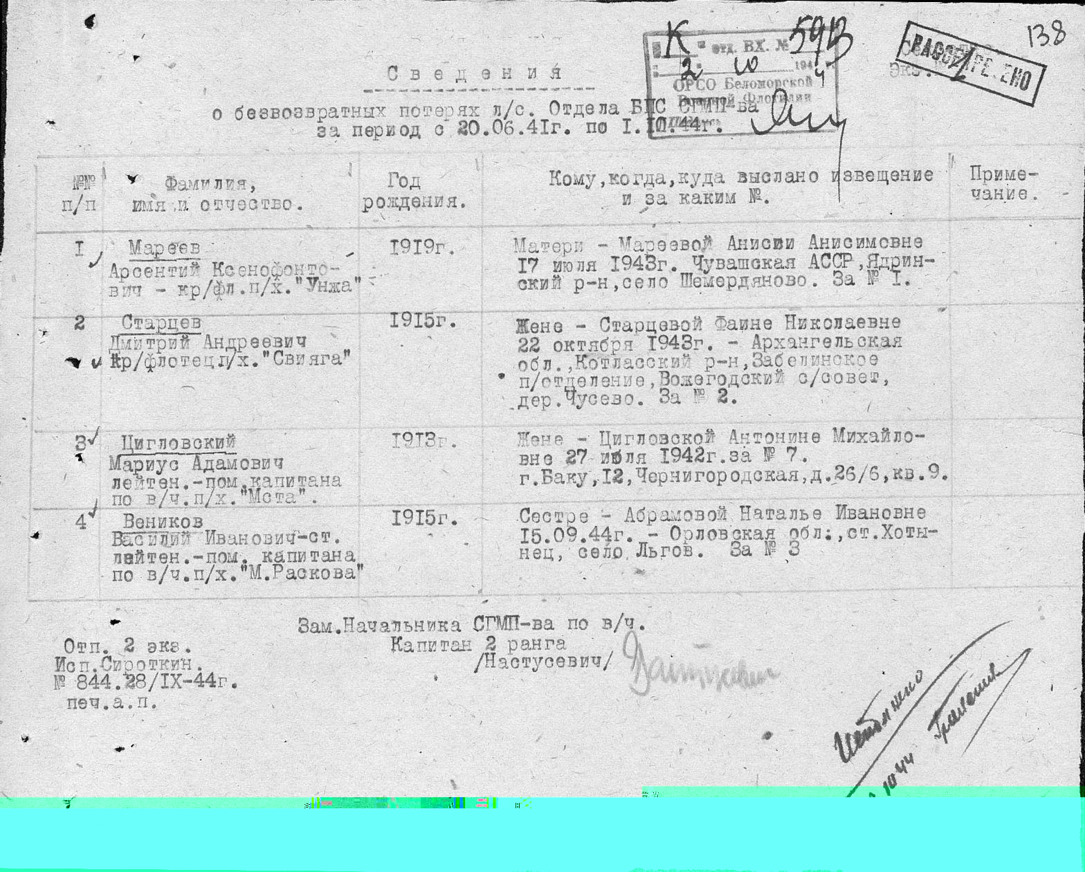 Список безвозвратных потерь командно-начальствующего состава Беломорской военной флотилии (ЦВМА, Ф. 1650, О. 1, Д. 11).