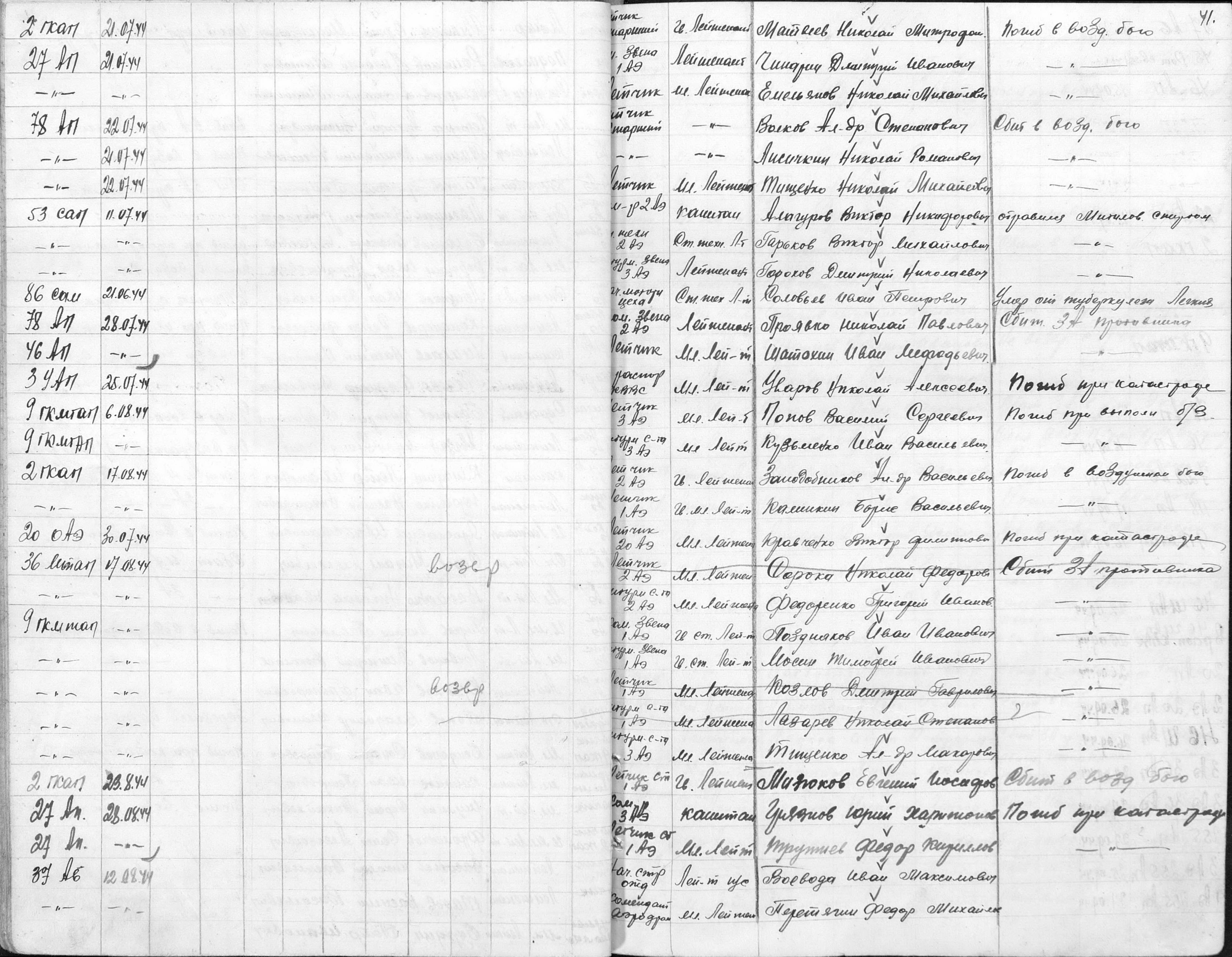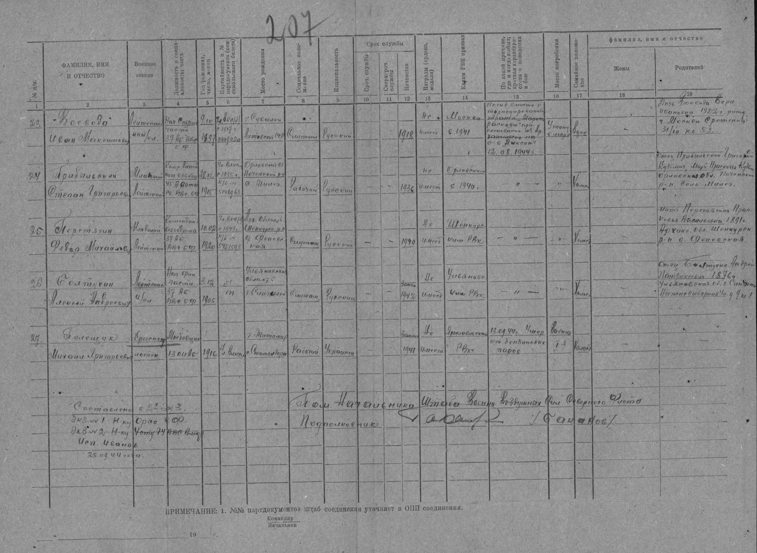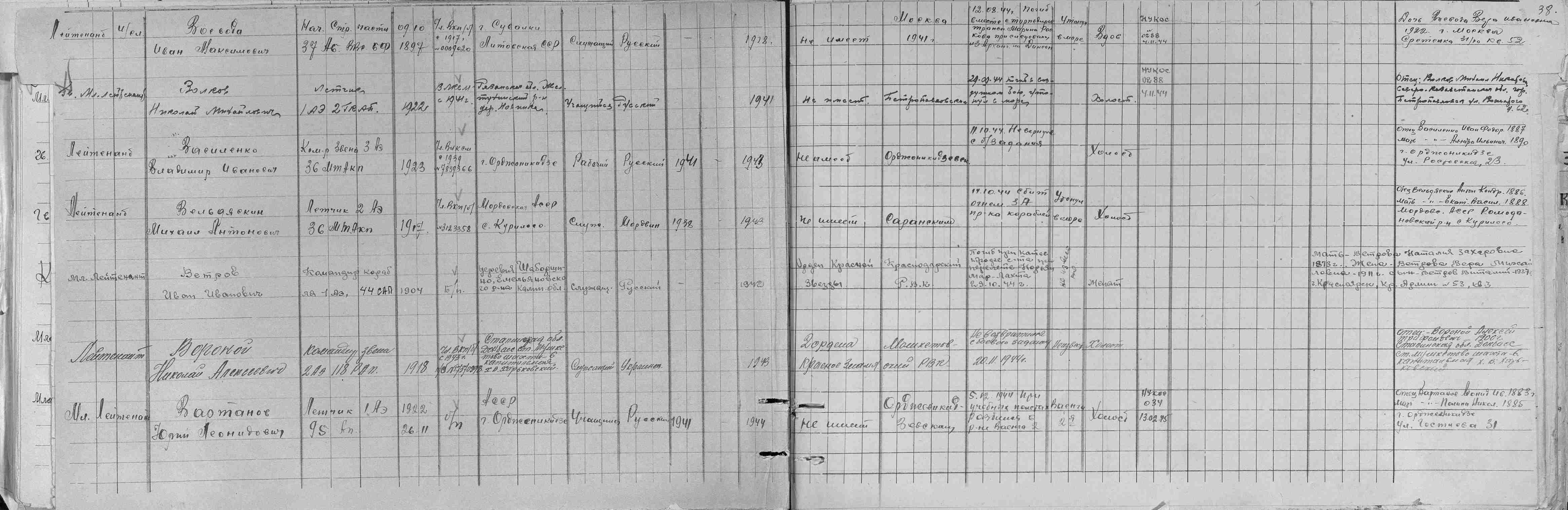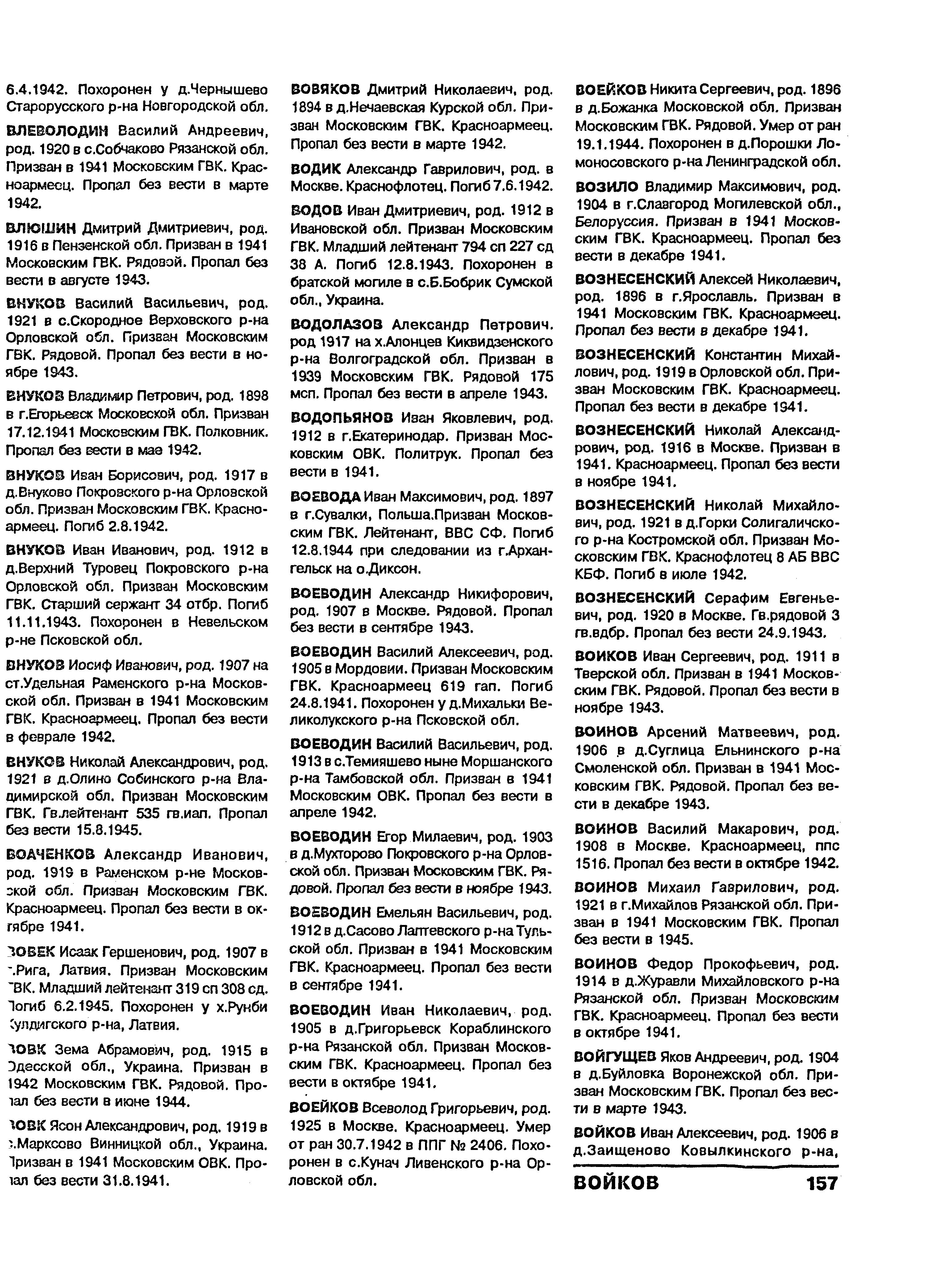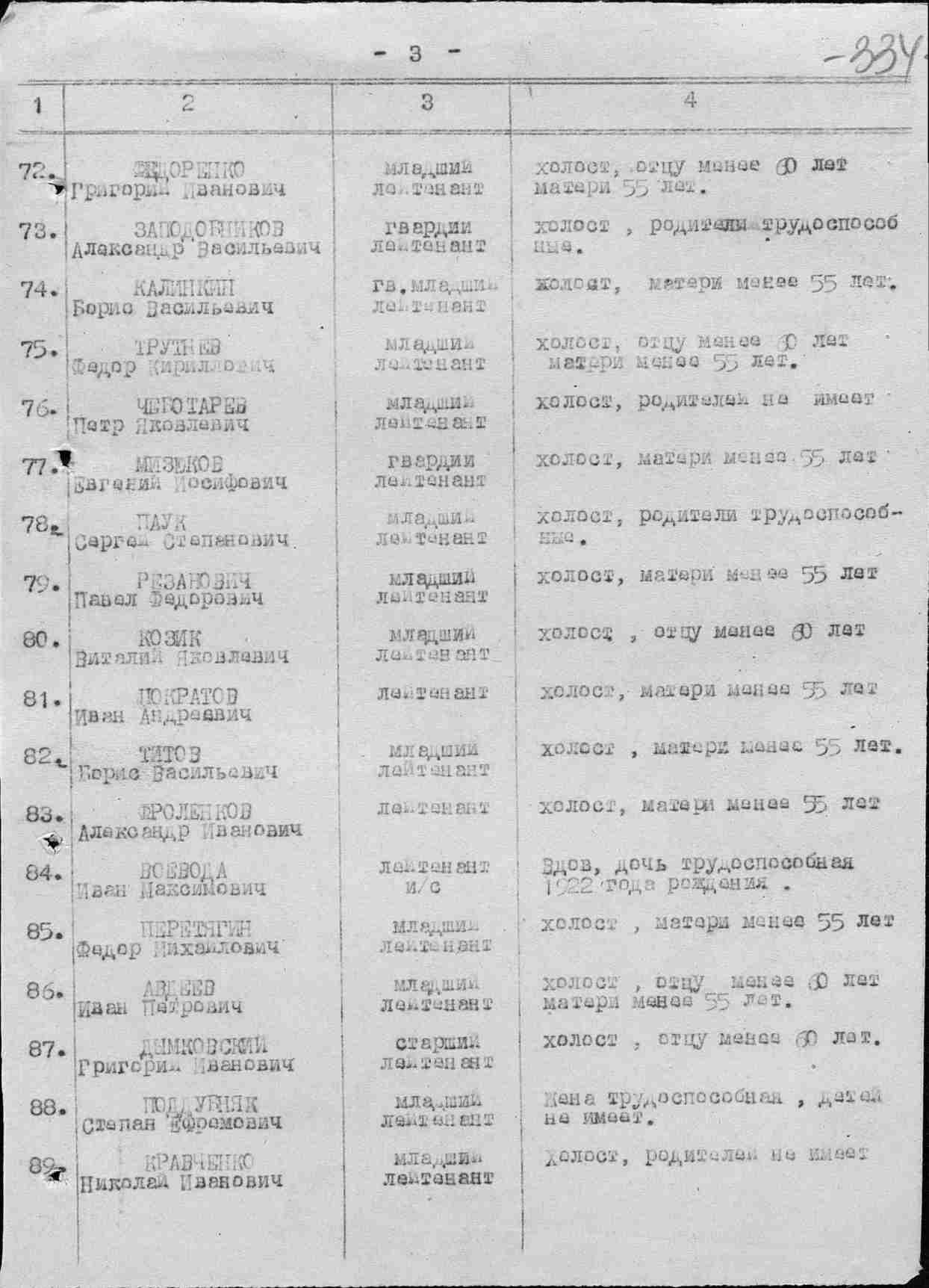 107. Воевода Иван Максимович, пассажир транспорта «Марина Раскова», воинское звание – капитан интендантской службы; должность и специальность – начальник строевой части (строевого отделения) 37 авиабазы ВВС СФ; дата рождения – 09.10.1897 г.; партийность и № партдокумента (комсомольского билета) – член ВКП (б) с 1917 г., 0009020; место рождения – г. Сувалки, Литовская ССР; социальное положение – служащий; национальность – русский; срок службы (начсостав) – 1918 г.; каким РВК призван – г. Москва в 1941 г.; по какой причине, где и когда выбыл – погиб вместе с торпедированным транспортом «Марина Раскова» при следовании из Архангельска на о-в Диксон, 12.08.1944 г.; семейное положение – вдовец; родственники (фамилия, имя, отчество, адрес) – дочь: Воевода Вера Ивановна, 1922 г.р., г. Москва, Сретенка, 31/10, кв. 52.