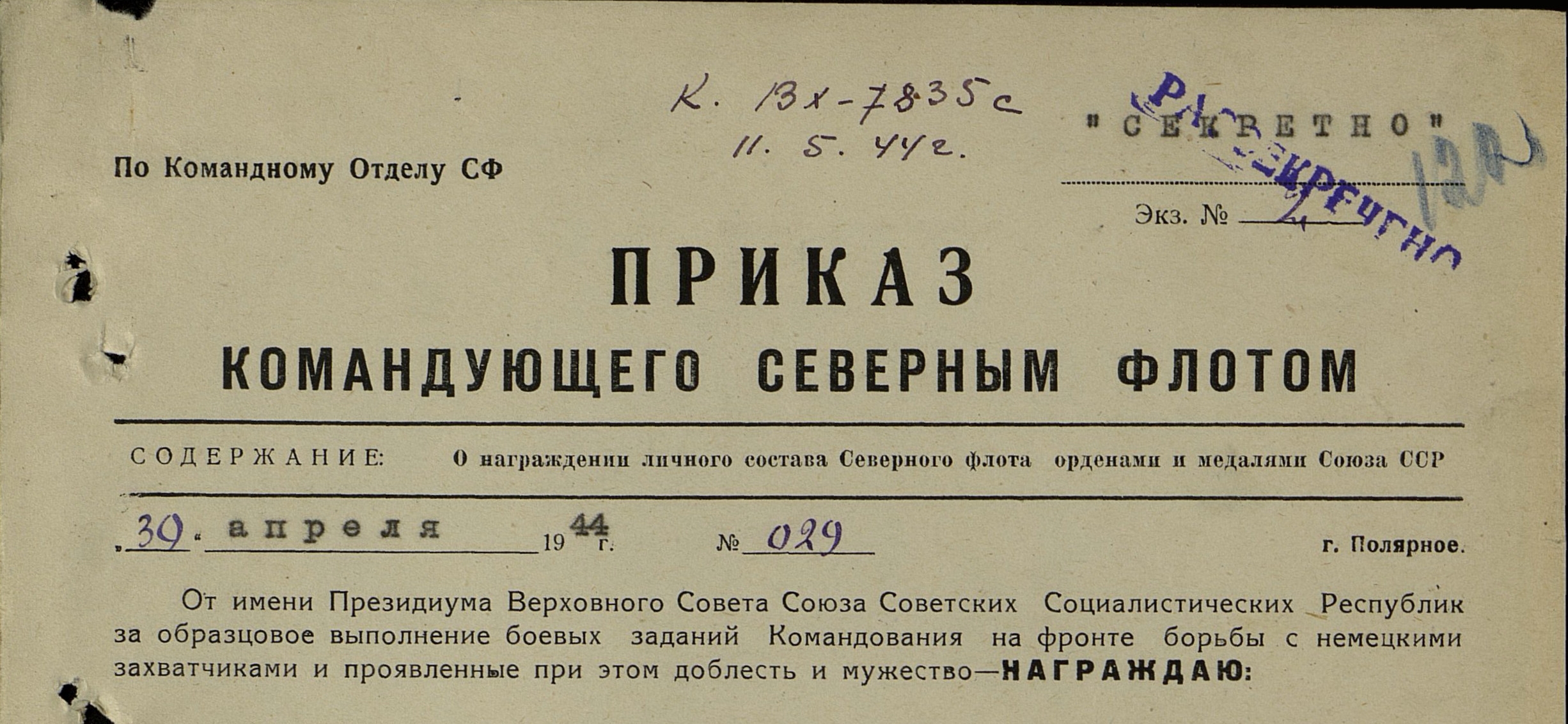 С апреля 1943 года служил на Северном флоте на ГИСУ «Масштаб». В ноябре 1943 г. прибыл в США на ТЩ-118 для выполнения правительственного задания по переводу корабля из США в СССР. Несмотря на короткий срок пребывания в США, быстро освоил современную американскую технику и правильно ее использовал. За этот же короткий срок сумел подготовить вверенный ему личный состав к океанскому переходу в зимних условиях. На всем переходе из США в СССР материальная часть работало безотказно. Будучи штурманом группы кораблей, обеспечил безопасность плавания этой группы, точность и своевременность пребывания ее в порт назначения. С 20 января по 29 февраля 1944 г. корабль прошел через районы военных действий, насыщенности (?) этих районов неприятельскими подлодками с постоянной угрозой налета авиации и возможности встречи с наводными силами противника. Переход осуществлялся в условиях зимних штормов, а на пути между Англией и СССР корабль подвергся обледенению. С 1 февраля 1944 г. (?), находясь в пути от Бермудских островов к Азорским островам, была обнаружена и атакована неприятельская подлодка. С Англии до Кольского залива (20–29 февраля) корабль шел в составе конвоя, насчитывавшего 43 транспорта с ценным грузом. Транспорты прибыли без потерь. На всем переходе из США в СССР корабль периодически буксировал и давал топливо катерам БО. Катера прибыли в полной сохранности на Родину, тем самым пополнив боевое ядро СФ. За время пути из США в СССР пройдено 6820 миль за 36 ходовых суток. Корабль прибыл на Родину в полной боевой готовности. За время пребывания на СФ кораблем было проведен ряд операций по конвоированию 60 транспортов с ценным грузом и 52 – без груза. Все транспорты благополучно прибыли на место назначении. За то же время проведены три выхода на боевые траления, тем самым была обеспечена безопасность плавания транспортов и военных кораблей. За период нахождения на СФ пройдено 1915 миль за 19 ходовых суток. При выполнении боевых заданий материальная часть работала безукоризненно