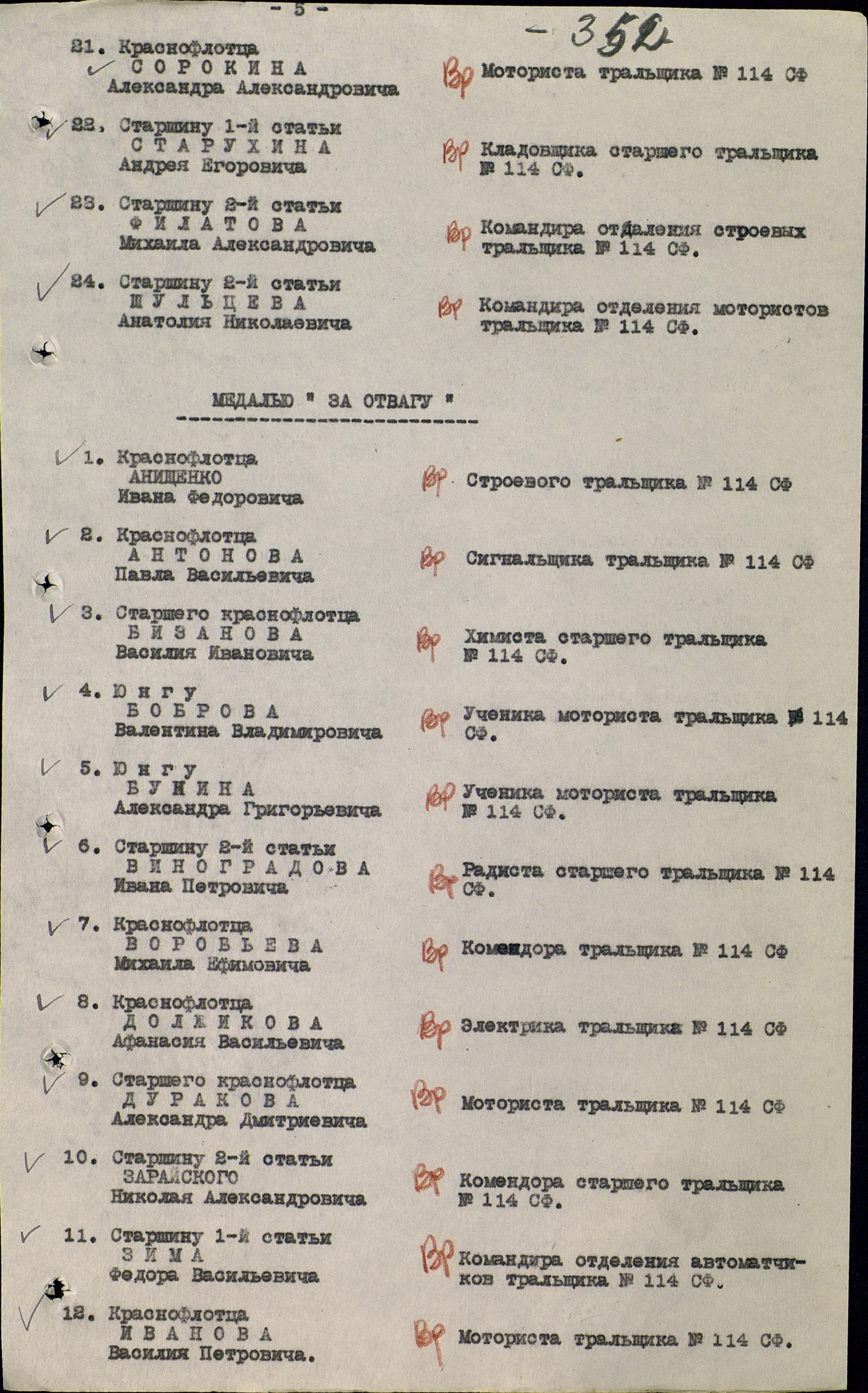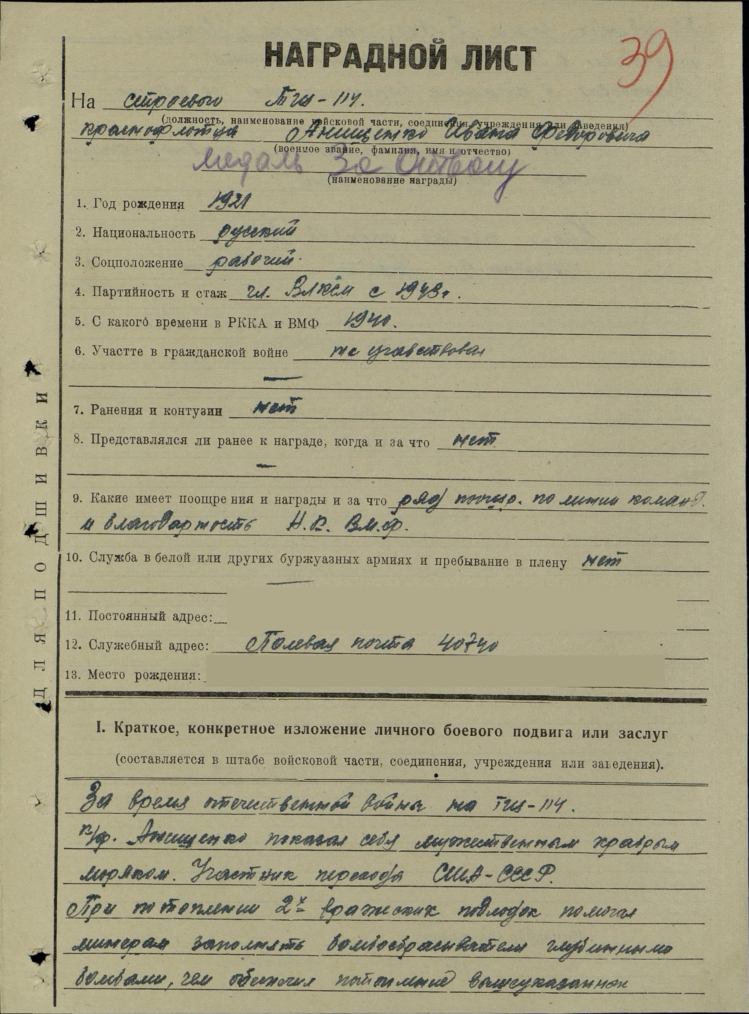 Анищенко Иван Федорович, воинское звание – краснофлотец; должность (специальность), часть – комендор 3 кл. (строевой), тральщик ТЩ-114 6 ДТЩ Бригада траления ОВР ГБ СФ; год рождения – 1921; место рождения – Курская обл., Черновский р-н; партийность – б/п (член ВЛКСМ с 1943 г.); социальное положение – рабочий; национальность – русский; срок срочной службы – 1941 г. (1940); каким РВК призван – Ораниенбаумским РВК; награды – медаль «За отвагу»; по какой причине, где и когда выбыл – погиб в море при выполнении боевого задания 12.08.1944 г.; служебный адрес – п/п 40740; семейное положение – холост; родственники (ФИО, адрес) – мать, Анищенко Федора Антоновна, Черновский р-н, д. Орли (д. Орш…); дополнительная информация – имел ряд поощрений по линии командования и благодарность от НК ВМФ, в 1941 г. при угрозе г. Москвы участвовал в боях на сухопутном фронте, участвовал в тралении вражеских мин на катерах КБФ, участник выполнения правительственного задания по приемке и переводу кораблей из США в СССР, участвовал в уничтожении двух вражеских ПЛ.