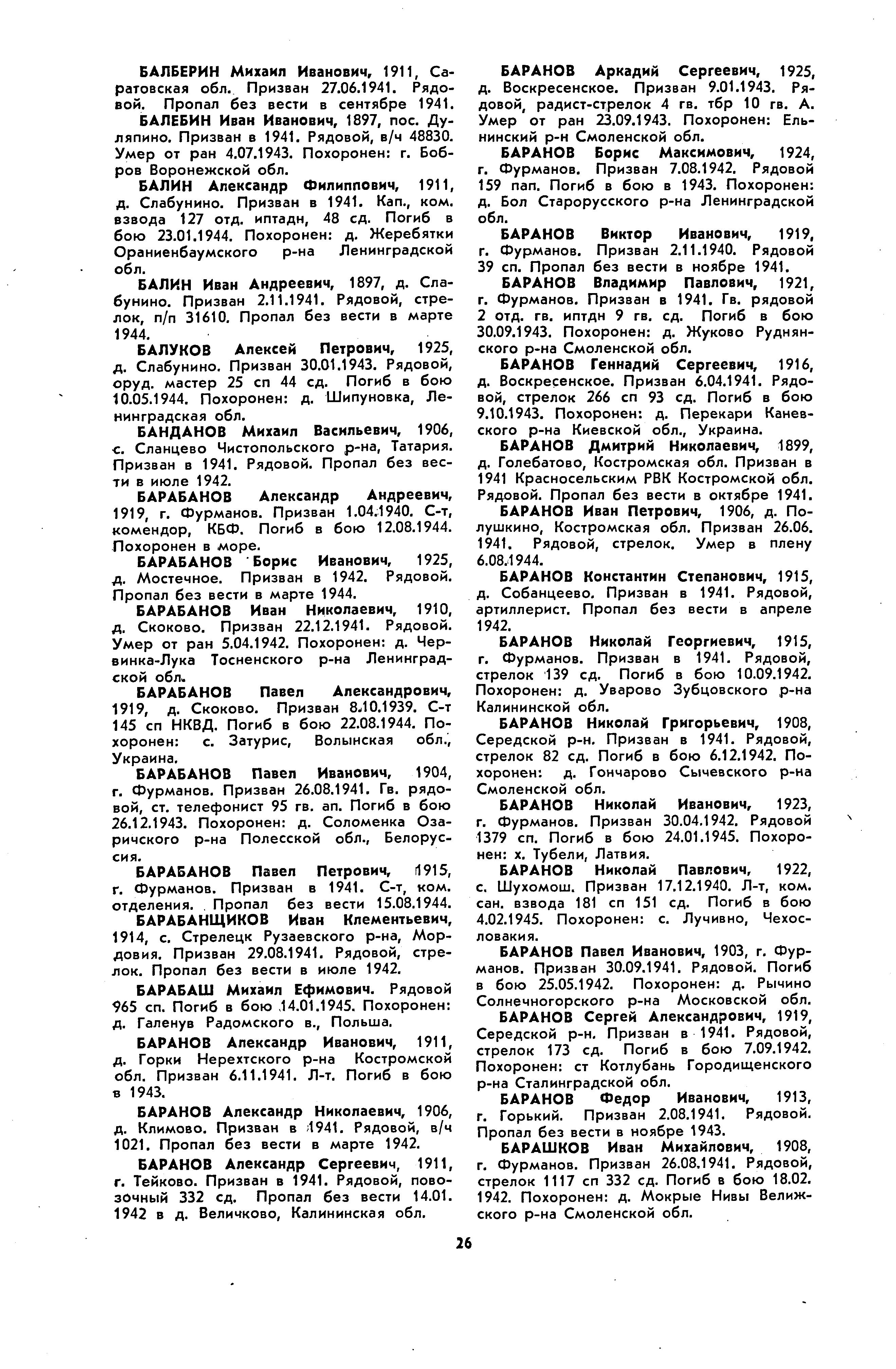Барабанов Александр Андреевич, воинское звание – ст. краснофлотец; должность (специальность), часть – комендор 3 кл., тральщик ТЩ-114 6 ДТЩ Бригада траления ОВР ГБ СФ; год рождения – 1919; место рождения – Ивановская обл., Фурмановский р-н (г. Фурманов); партийность – член ВЛКСМ (кандидат в члены ВКП(б) с 1942 г.); социальное положение – рабочий; национальность – русский; срок срочной службы – 1940 г. (1939); каким РВК призван – Фурмановским РВК; награды – орден Красной Звезды; по какой причине, где и когда выбыл – погиб в море при выполнении боевого задания 12.08.1944 г.; служебный адрес – п/п 40740; семейное положение – холост; родственники (ФИО, адрес) – сестра, Барабанова Полинария (Полинарья) Андреевна, Фурмановский р-н, с. Дзержинск (Дзержинское), д. 27; дополнительная информация – имел благодарности от НК ВМФ, командующего СФ, командующего БВФ, участвовал в операциях, проводимых катерами 1 Балтийского отряда НКВД, в качестве комендора наводчика участник выполнения правительственного задания по приемке и переводу корабля из США в СССР, участник потопления двух ПЛ противника. Его сестра, Погодина Полина Андреевна, жила в 70–80-е годы прошлого века по адресу: 157760, Костромская обл., пос. Вохма, ул. Горького, д. 13, кв. 2.