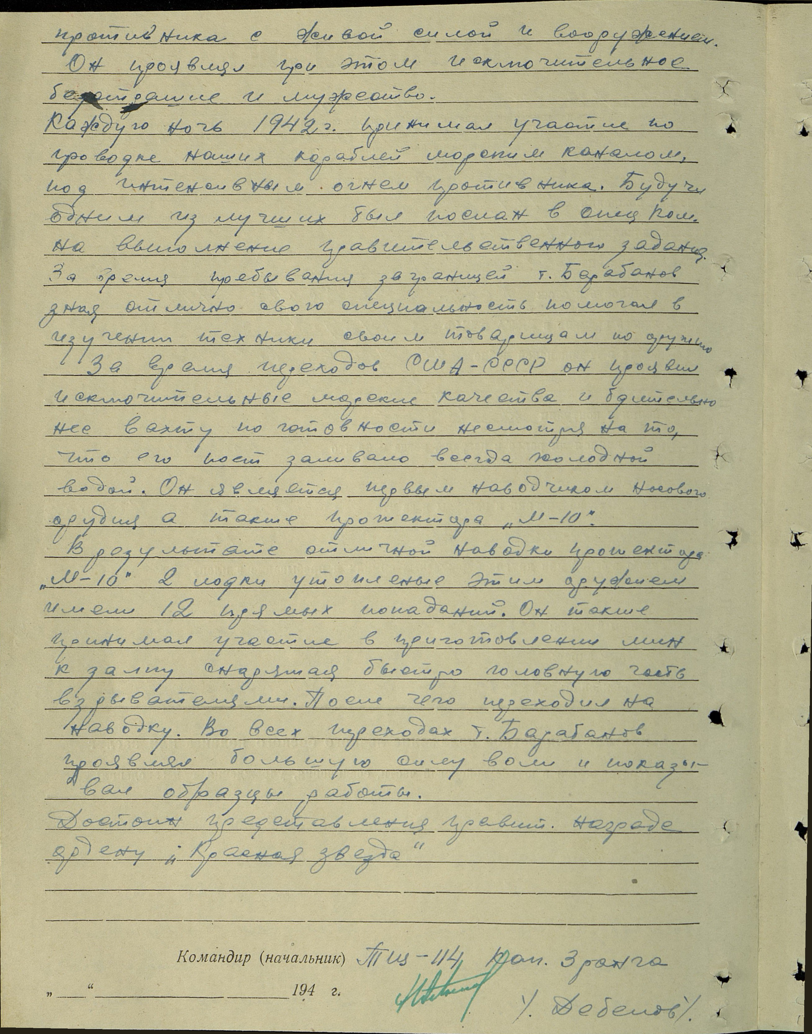 Каждую ночь 1942 года принимал участие по проводке наших кораблей морским каналом под интенсивным огнем противника. Будучи одним из лучших, был сослан в спецкоманду на выполнение правительственного задания. За время пребывания за границей тов. Барабанов, зная отлично свою специальность, помогал в изучении техники своим товарищам по оружию.