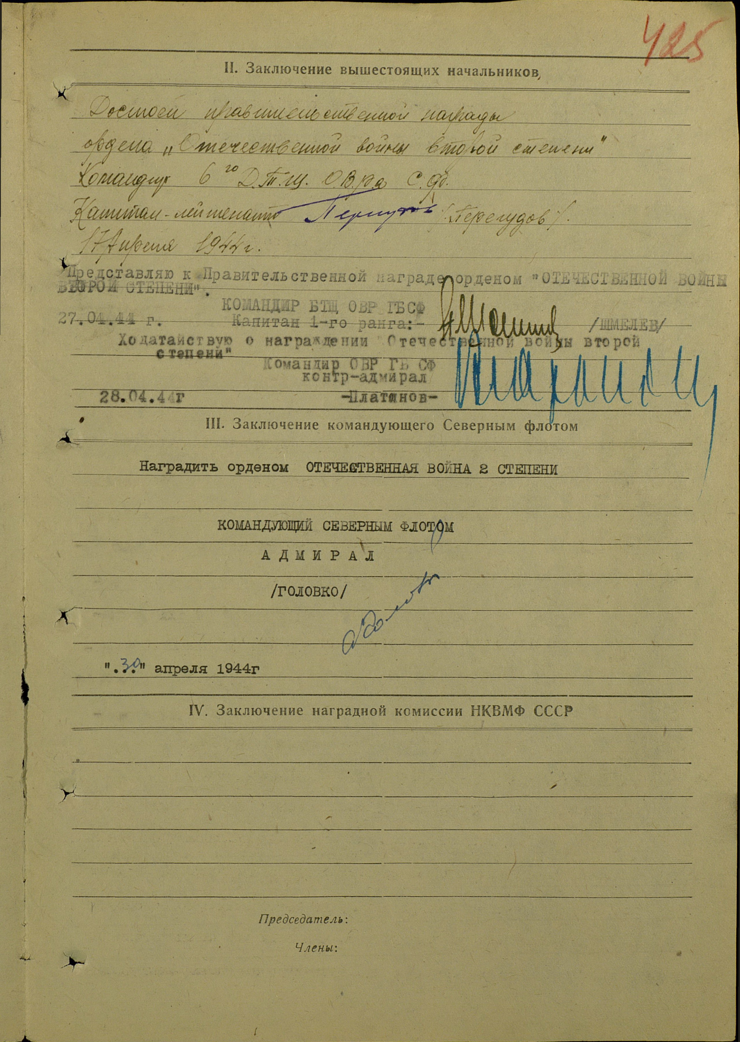 За образцовое выполнение правительственного задания, за проявленную доблесть и мужество в борьбе против немецко-фашистских захватчиков представляю тов. Блинова к правительственной награде – ордену Отечественной войны II степени.