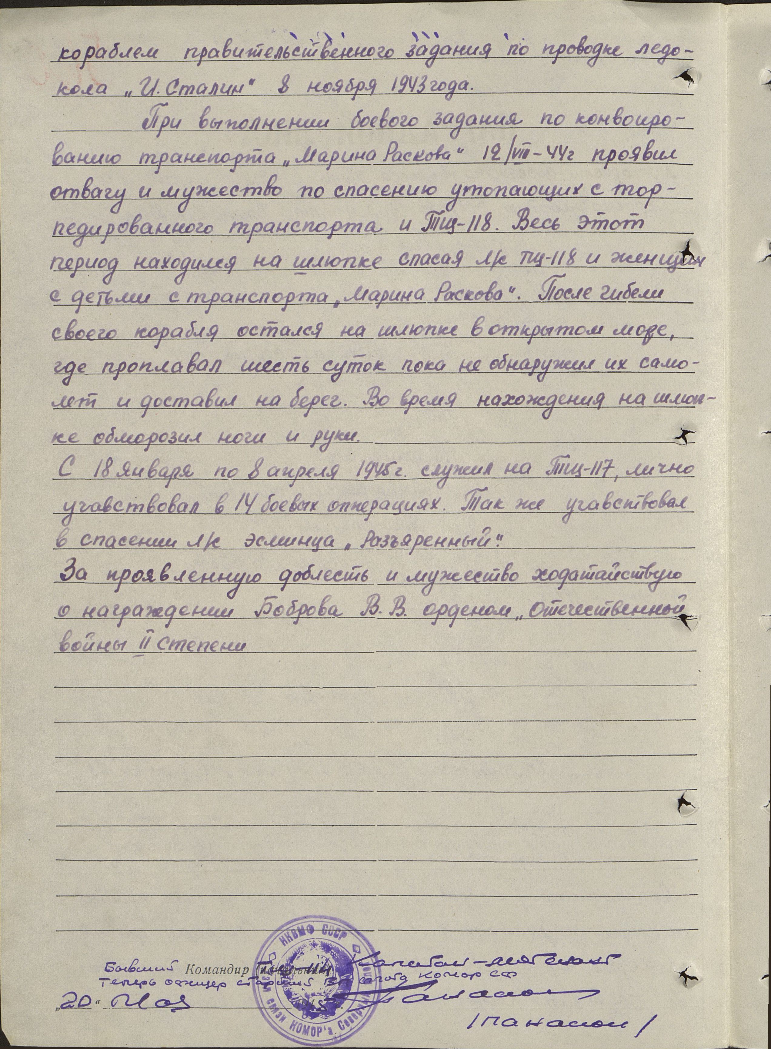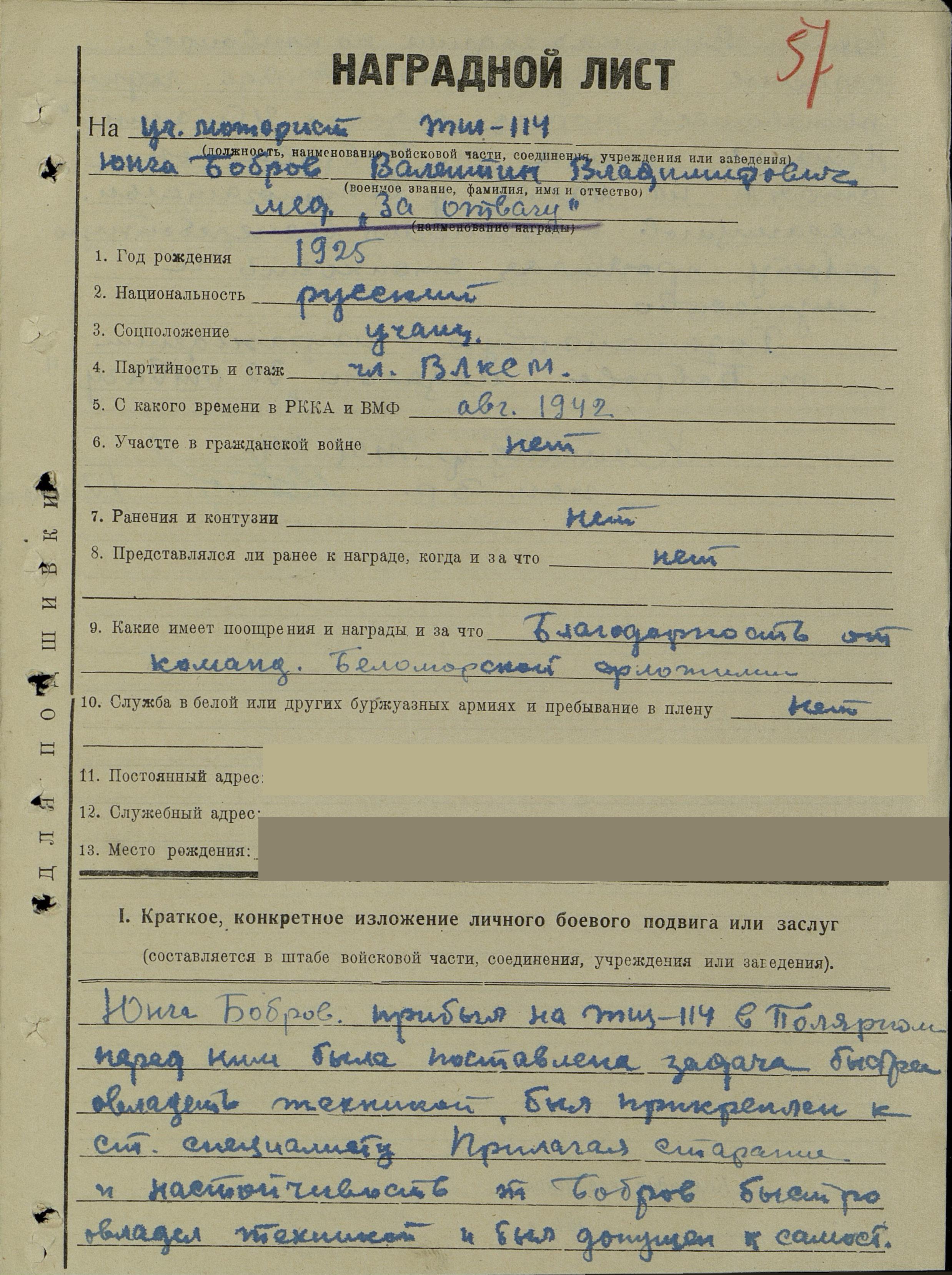 Юнга Бобров прибыл на ТЩ-114 в Полярном, перед ним была поставлена задача быстро овладеть техникой, был прикреплен ст. специалисту. Прилагая старание и настойчивость, т. Бобров быстро овладел техникой и был допущен к самостоятельной вахте. Выполняя задание по конвоированию ледоколов, были уничтожены две подводные лодки, пытавшееся торпедировать ледокол «И. Сталин». Немалая заслуга [в потоплении подводных лодок противника] т. Боброва, он стоял на вахте у вспомогательных механизмов и обеспечил [их] бесперебойную работу, проявляя стойкость и мужество.