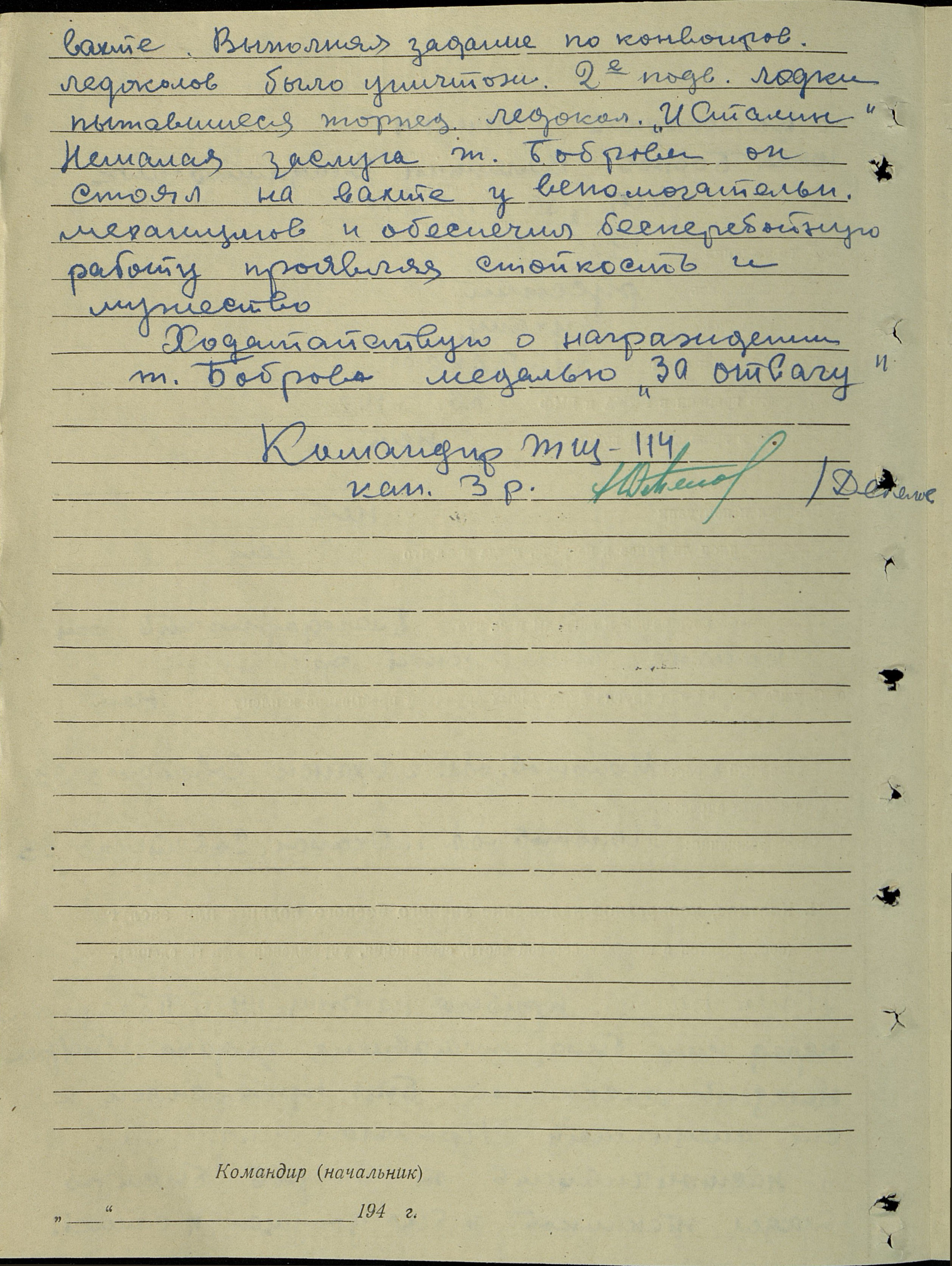 Ходатайствую о награждении т. Боброва медалью «За отвагу».