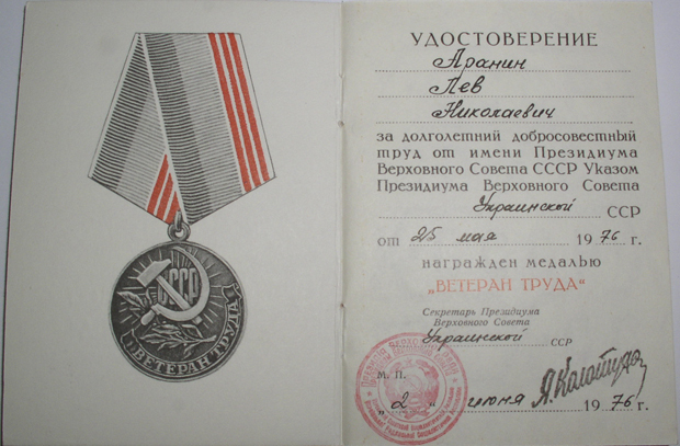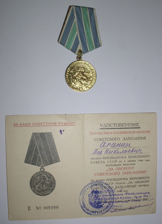 Аранин Лев Николаевич родился 5 марта 1912 г. на остр. Св Ольги в семье служащего (папа – Аранин Николай Дмитриевич, техник-строитель, мама – Аранина Ксения Федоровна, мещанка).