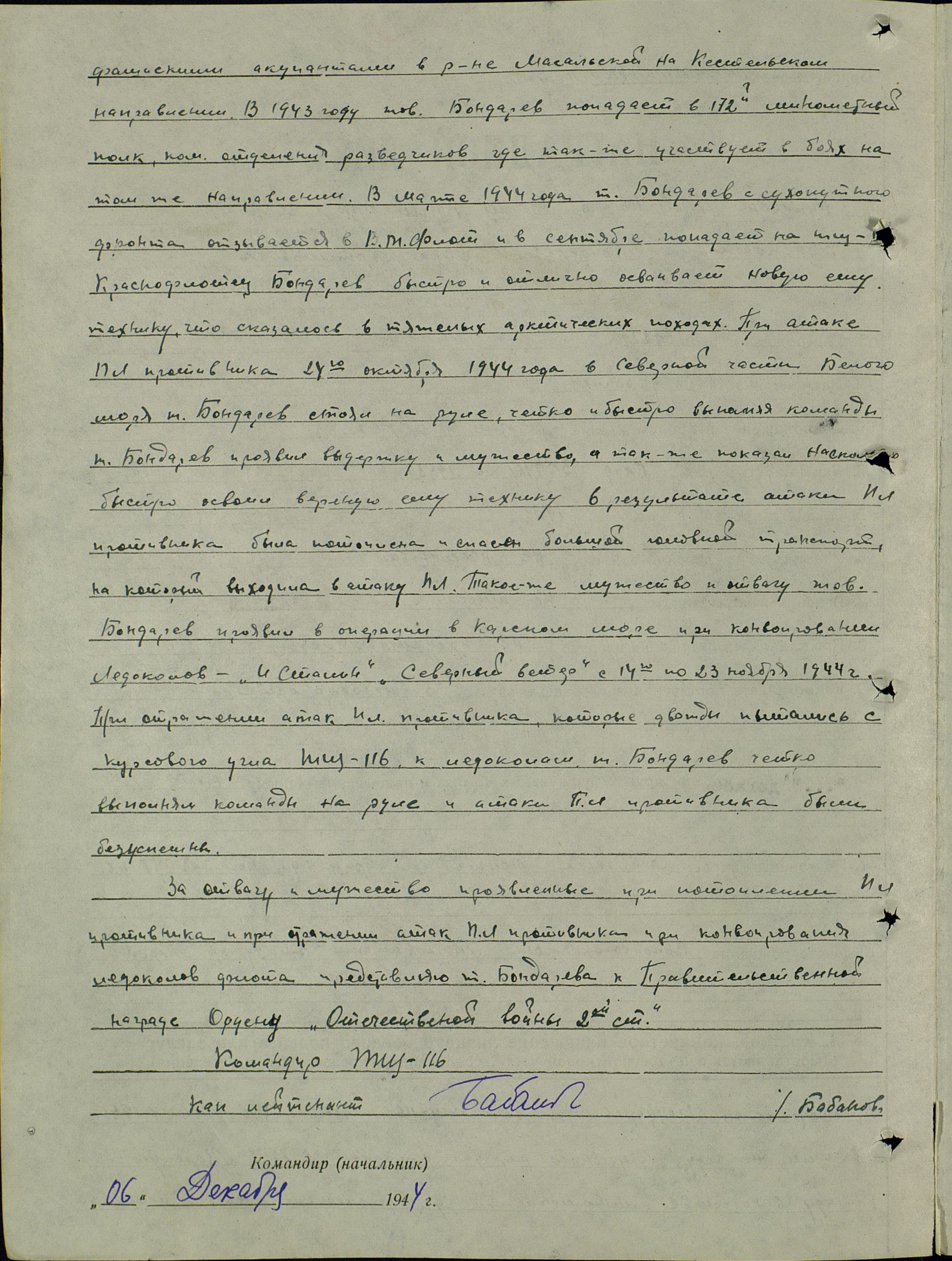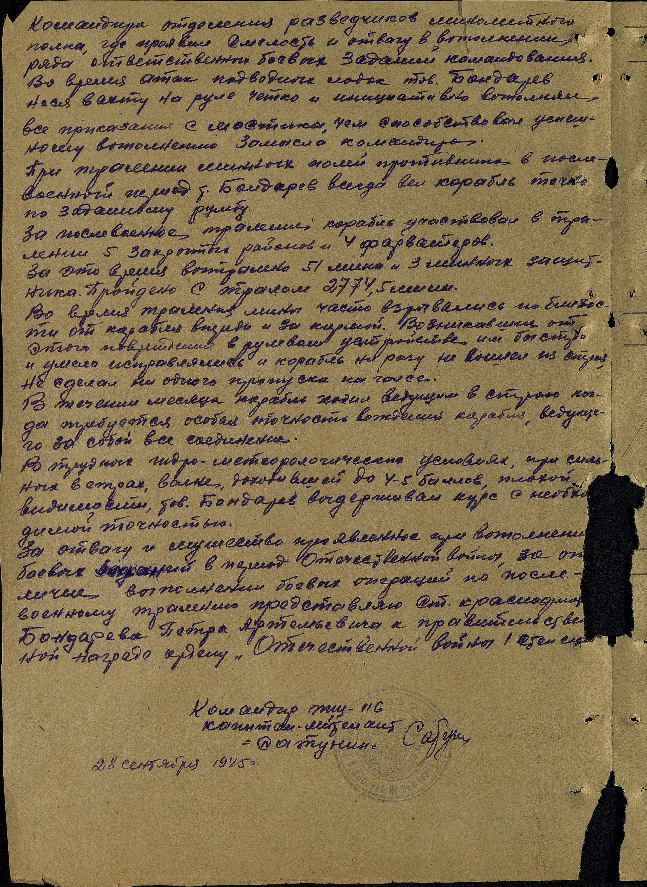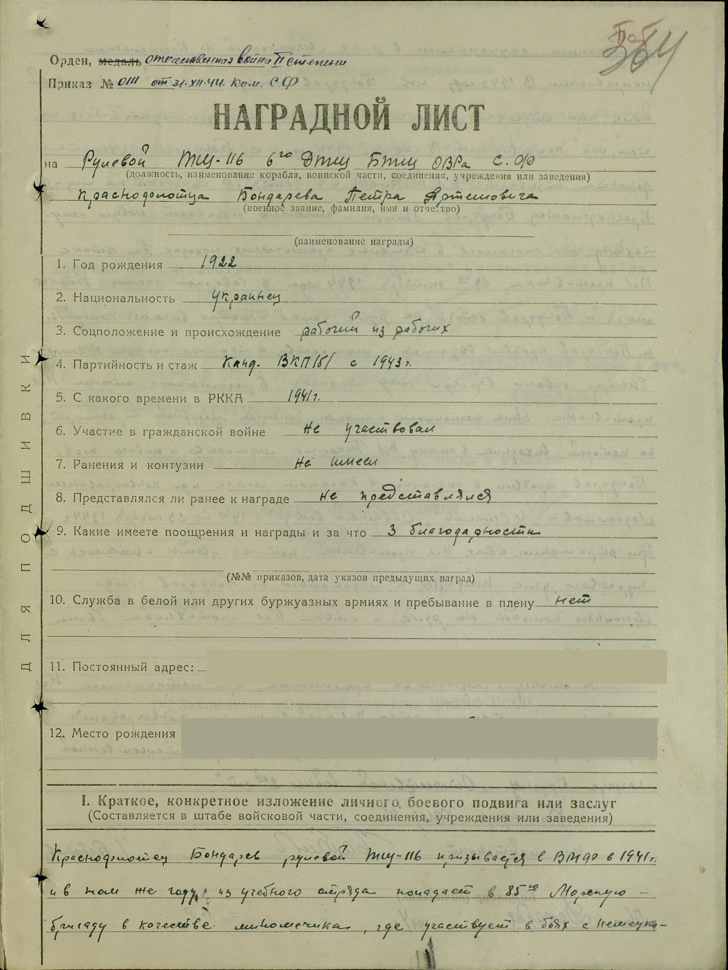 Краснофлотец Бондарев рулевой ТЩ-116 призывался в ВМФ в 1941 г. и в том же году из учебного отряда попал в 85 морскую бригаду в качестве минометчика, где участвовал в боях с немецко-фашистскими оккупантами в р-не Масальской на Кестельском направлении. В 1943 г. тов. Бондарев попал в 172 минометной полк командиром отделения разведчиков, где также участвует в боях на том же направлении. В марте 1944 г. т. Бондарев с сухопутного фронта отзывается в ВМФ и в сентябре 1944 г. попадает на ТЩ-… (дырка в тексте – С.Ш.). Краснофлотец Бондарев быстро и отлично осваивает новую для него технику, что сказалось в тяжелых арктических походах. При атаке ПЛ противника 24 октября в северной части Белого моря т. Бондарев стоял на руле, четко и быстро выполняя команды, т. Бондарев проявил выдержку и мужество, а также показал насколько быстро освоил вверенную ему технику. В результате атаки, ПЛ противника была потоплена и спасен большой головной транспорт, на которой выходила в атаку ПЛ. Такое же мужество и отвагу тов. Бондарев проявил в операции в Карском море при конвоировании ледоколов «И. Сталин», «Северный ветер» с 14 по 23 ноября 1944 г. При отражении атак ПЛ противника, которые дважды пытались с курсового угла [атаковать] ТЩ-116 к ледоколам (?), тов. Бондарев четко выполнял команды на руле, и атаки ПЛ противника были безуспешны.