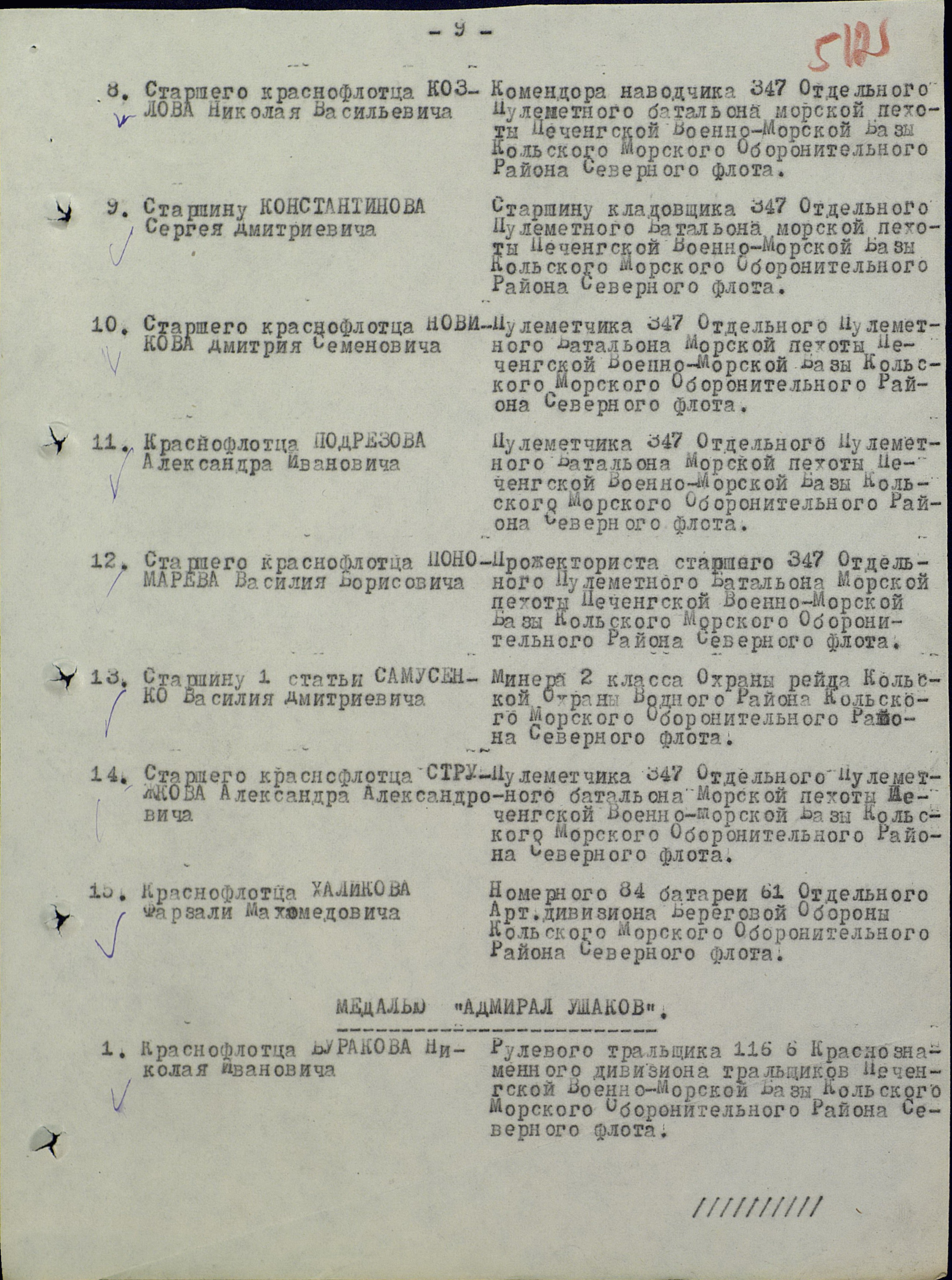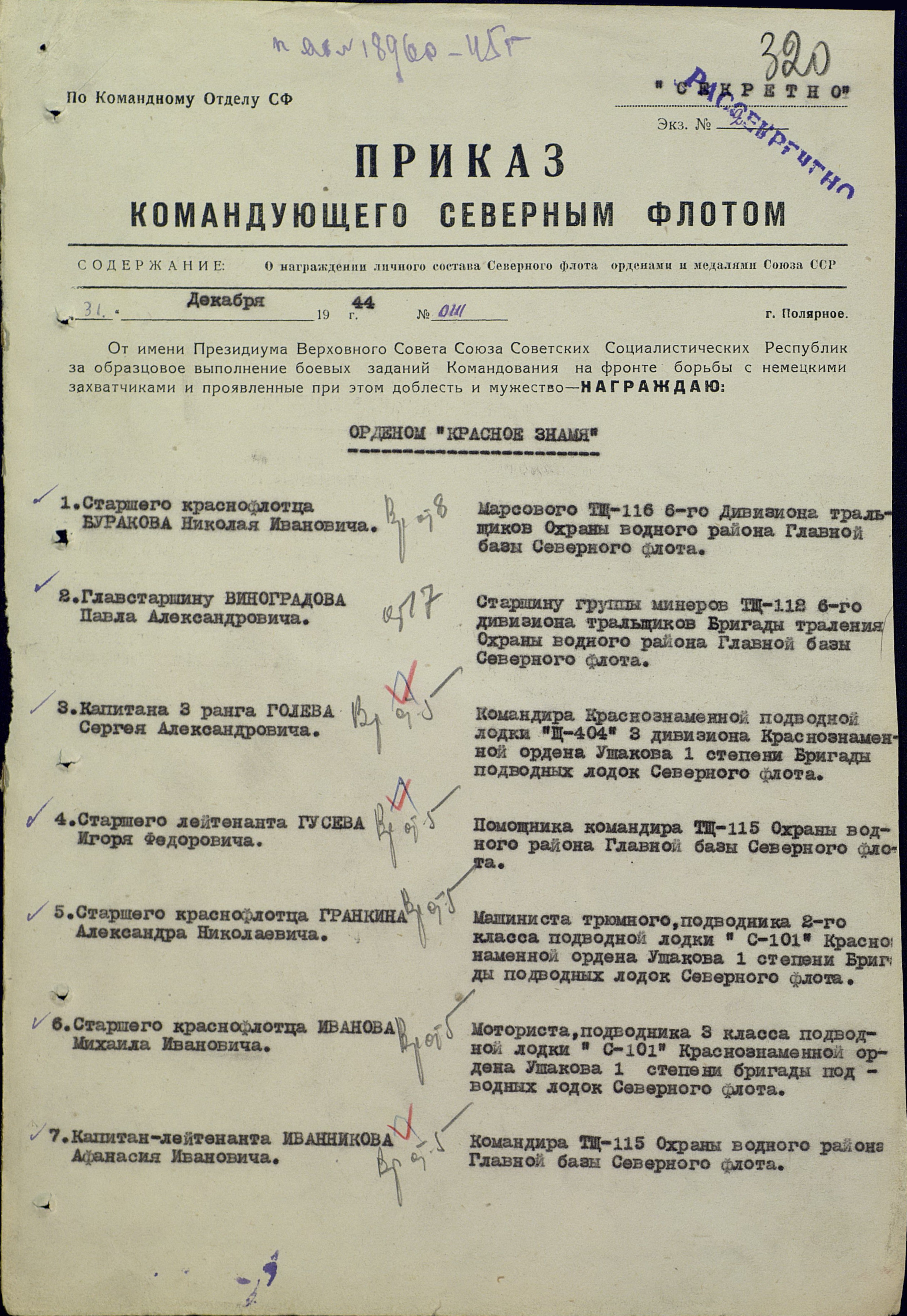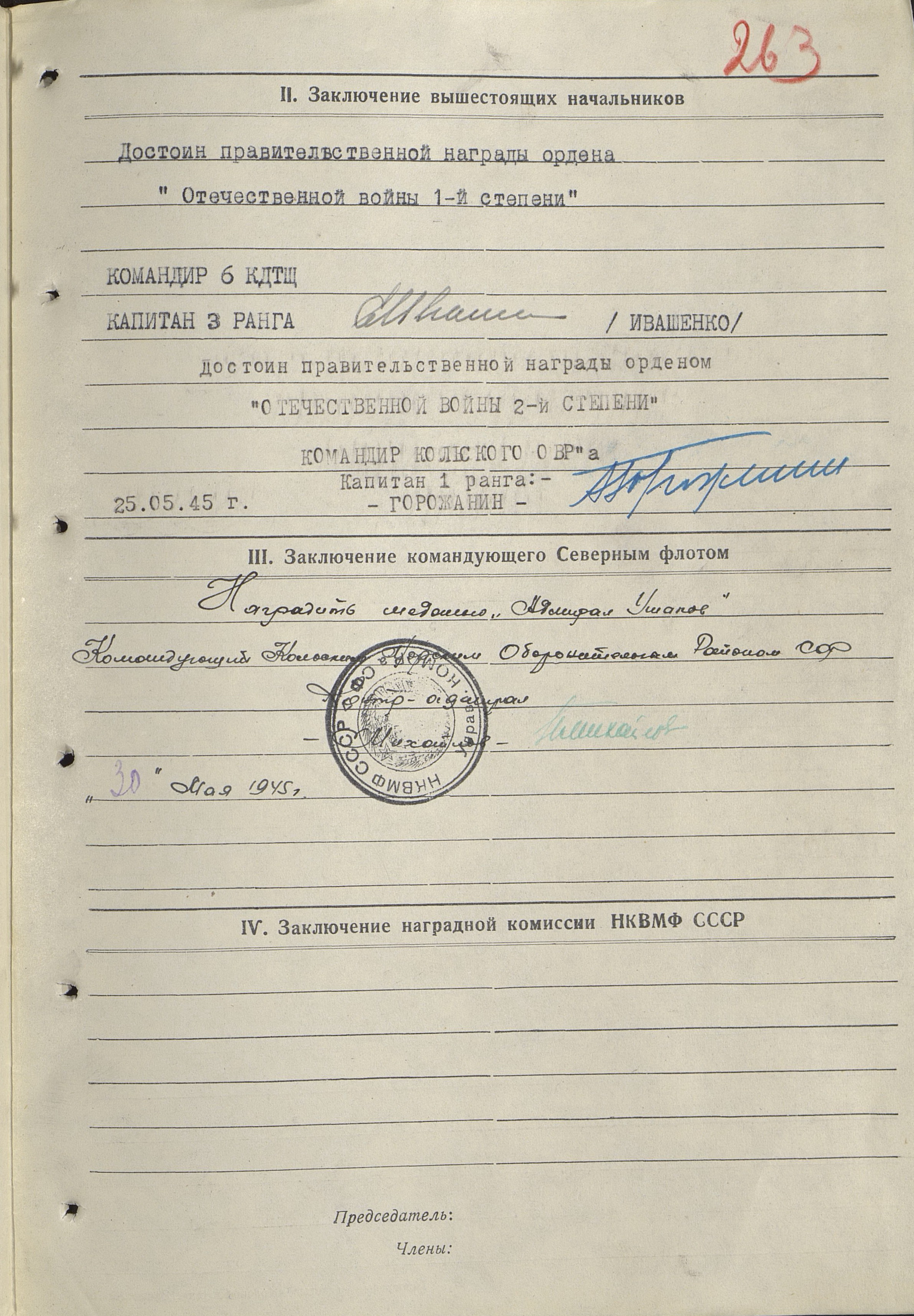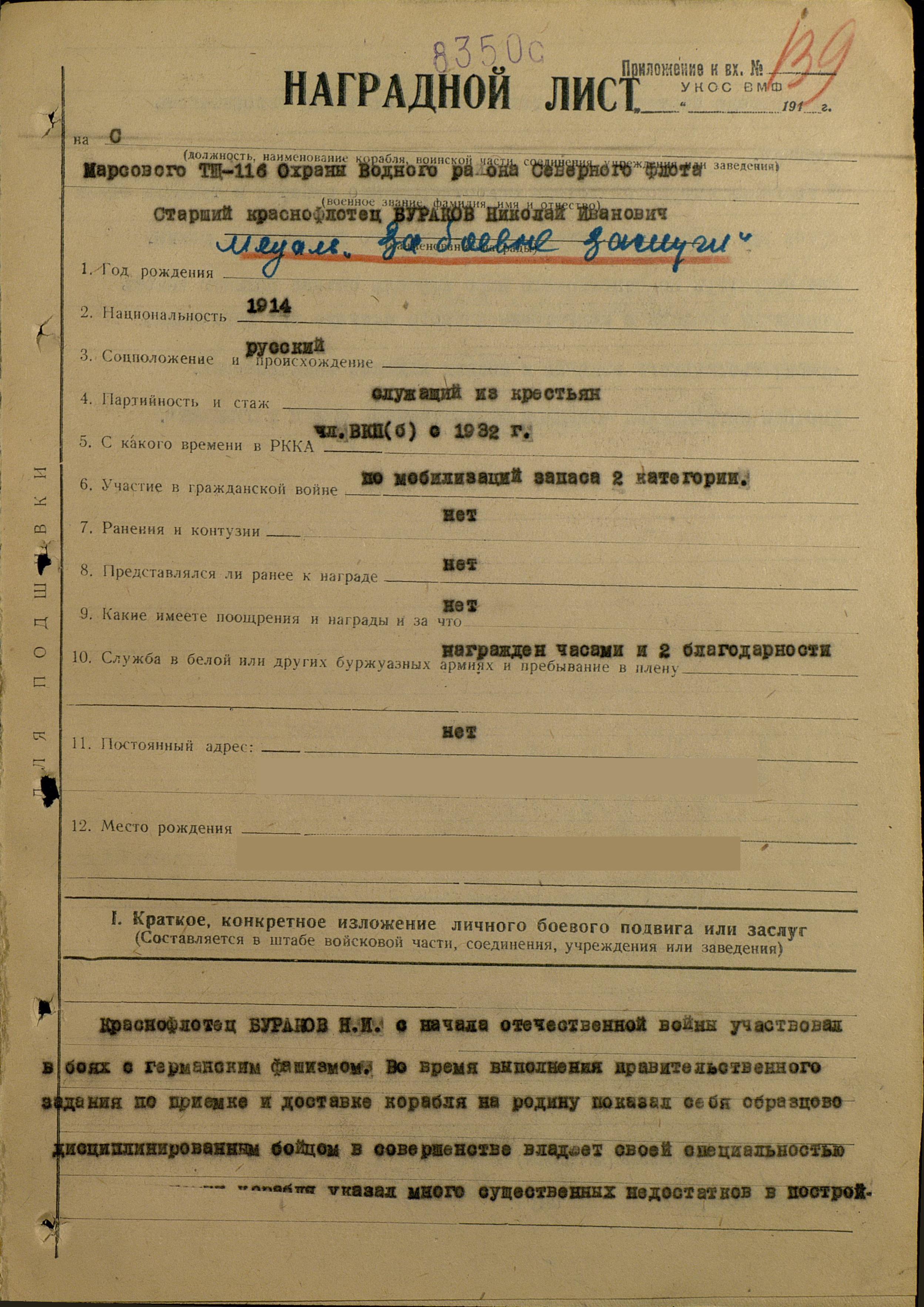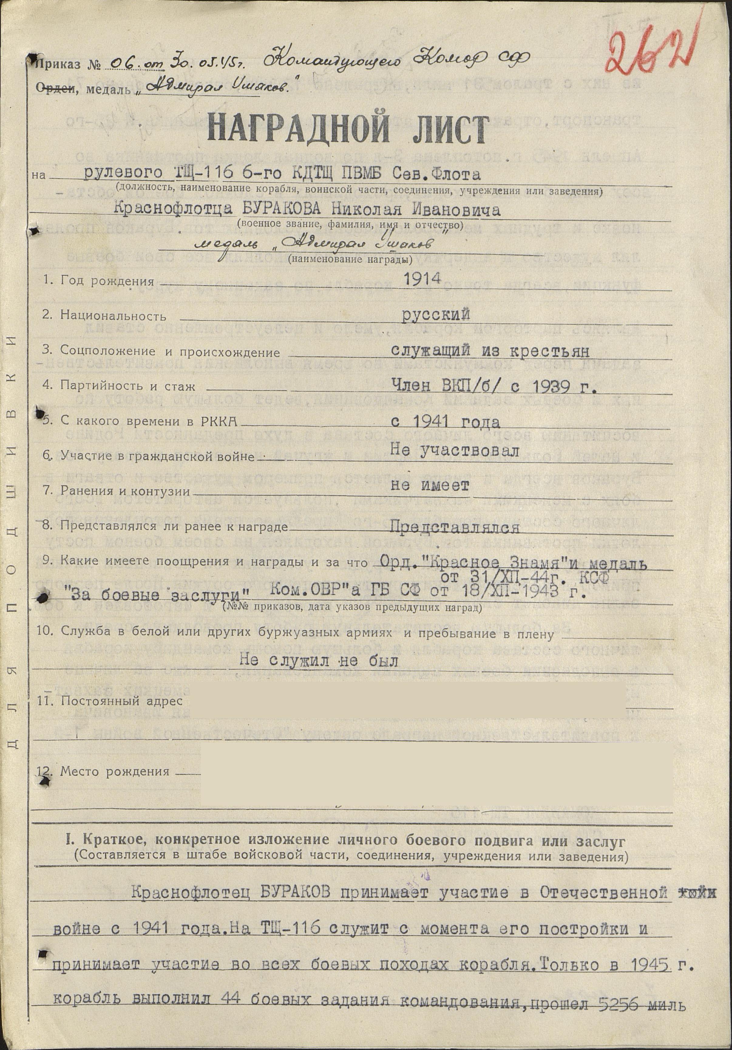За мужество и отвагу, проявленные в боях с немецко-фашистскими захватчиками, за огромную помощь командованию в деле мобилизации личного состава корабля на лучшее выполнение боевых заданий представляю Буракова Николая Ивановича к правительственной награде – ордену Красного Знамени.