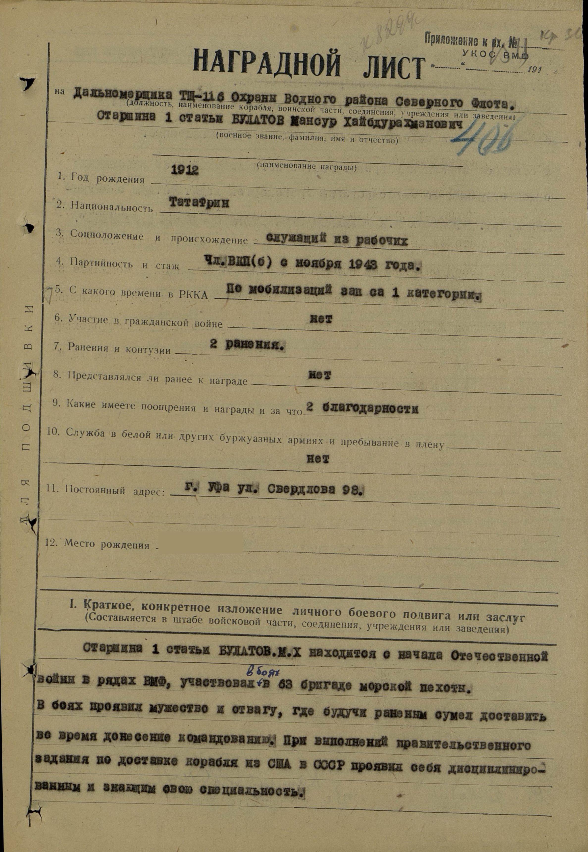 Старшина 1 статьи Булатов М.Х находился с начала Отечественной войны в рядах ВМФ, участвовал в боях в [составе] 63 бригады морской пехоты. В боях проявил мужество и отвагу, где, будучи раненым, сумел доставить вовремя донесение командованию. При выполнении правительственного задания по доставке корабля из США в СССР проявил себя дисциплинированным и знающим свою специальность [военнослужащим]. При конвоировании транспортов бдительно наблюдал в порученных ему секторах и обеспечивал бесперебойную связь. При атаке подводной лодки противника четко и быстро выполнял все приказания и обеспечивал сбрасывание глубинных бомб.