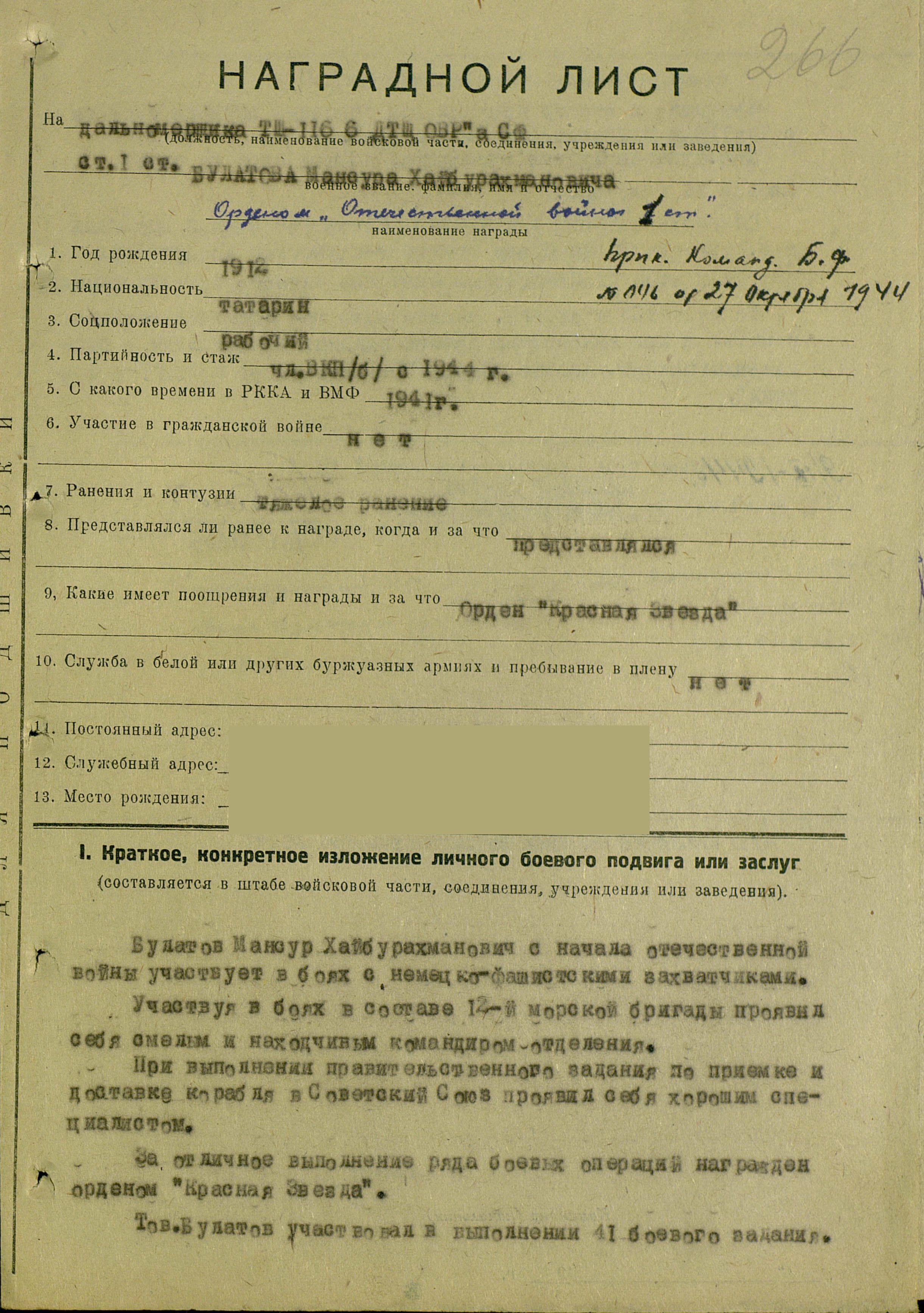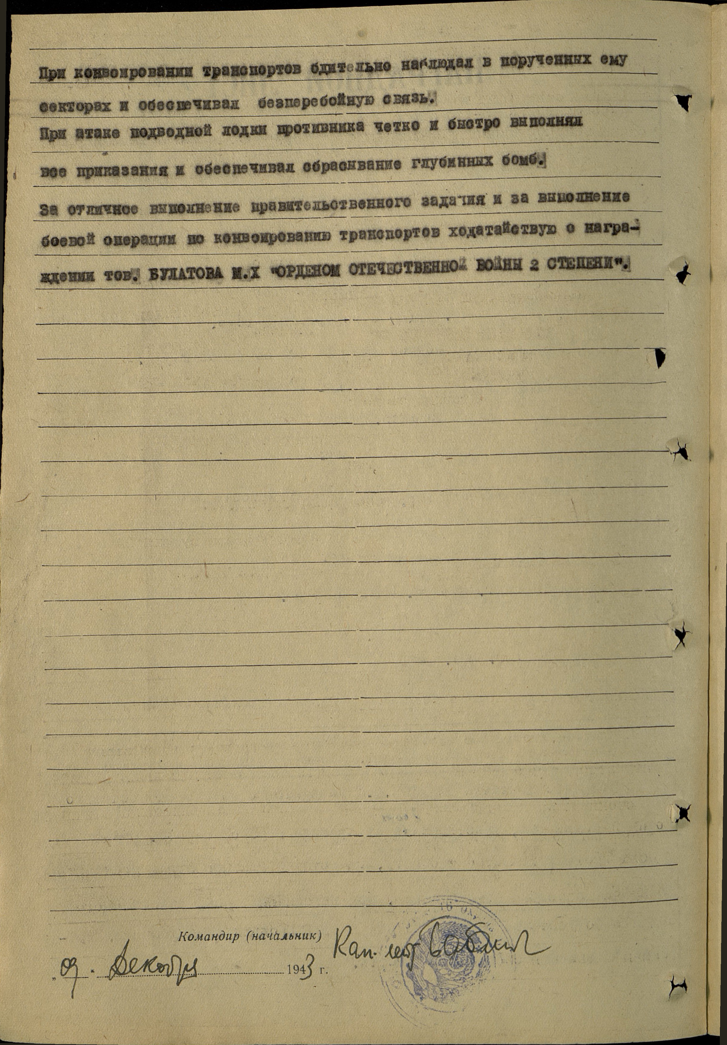 За отличное выполнение правительственного задания и за выполнение боевой операции по конвоированию транспортов ходатайствую о награждении тов. Булатова М.Х орденом Отечественной войны II степени.