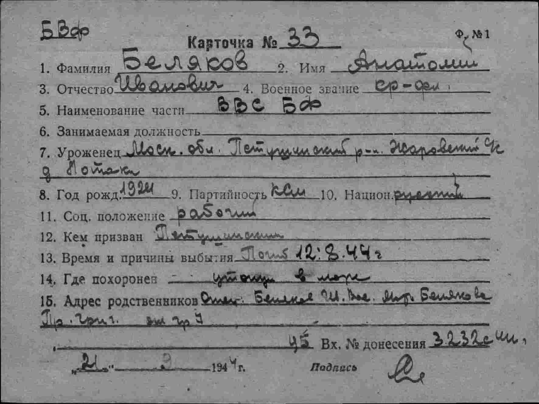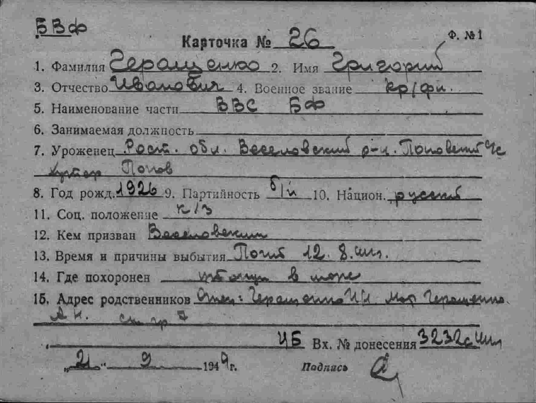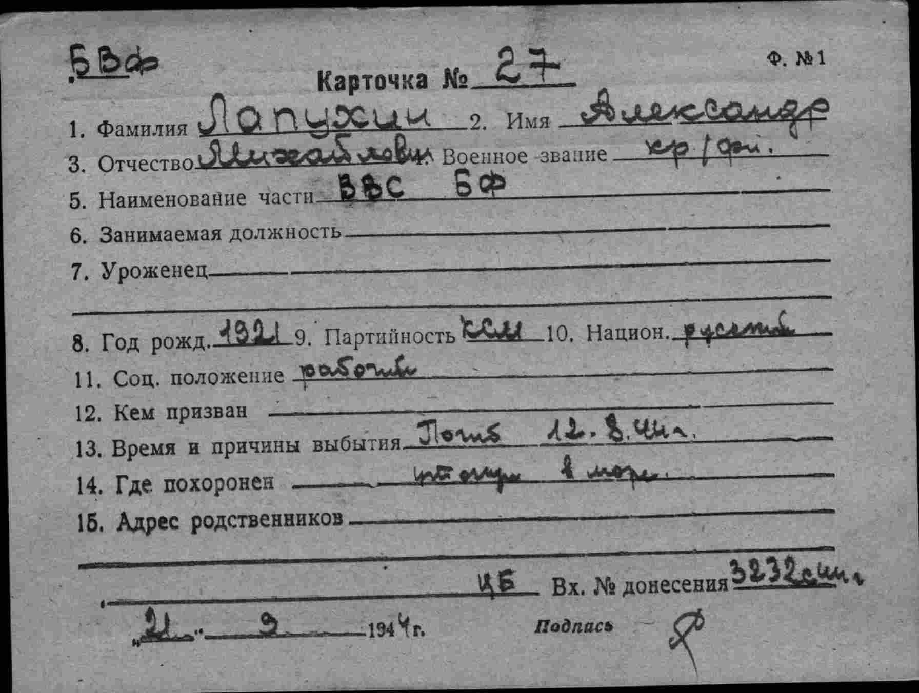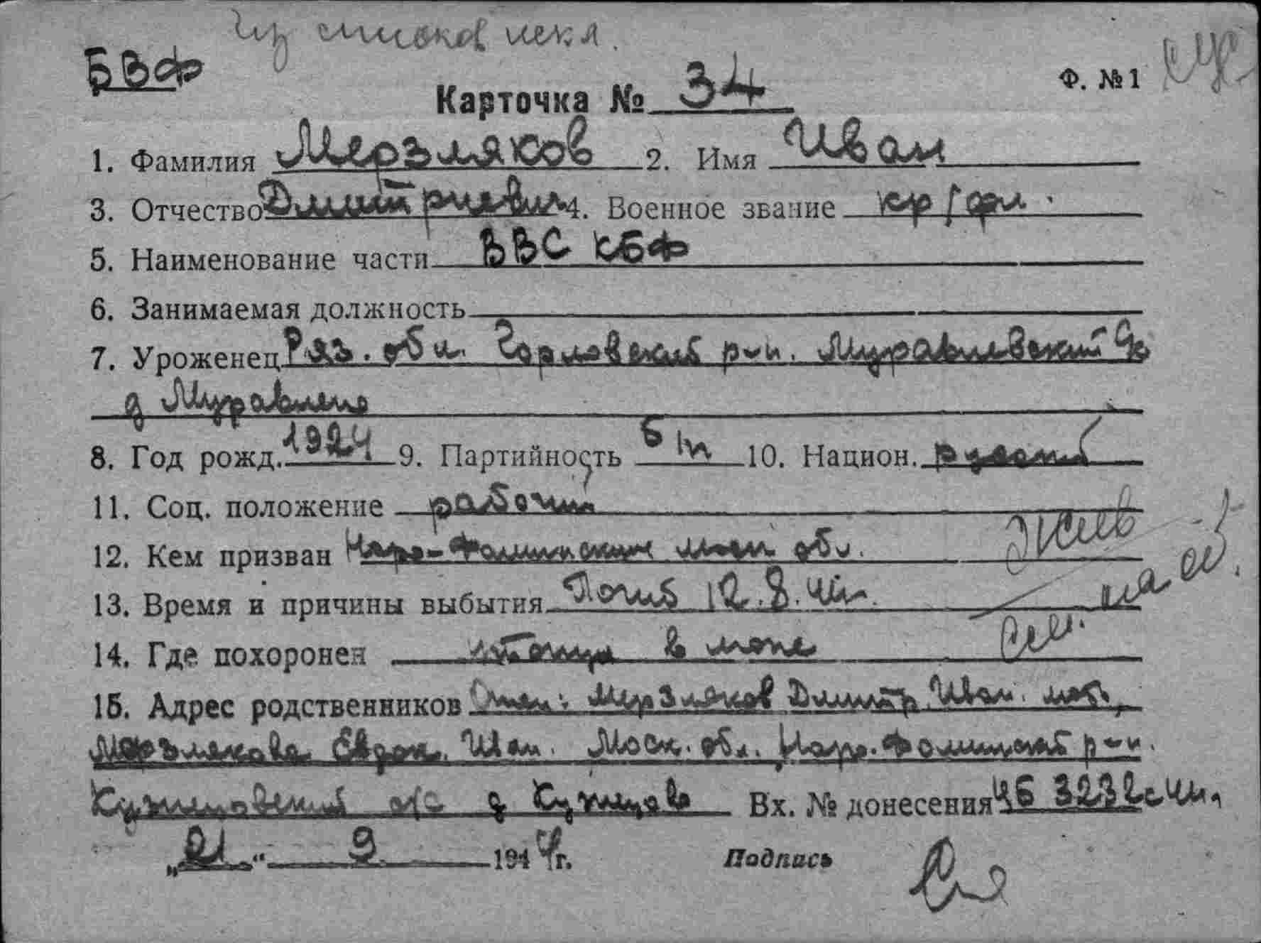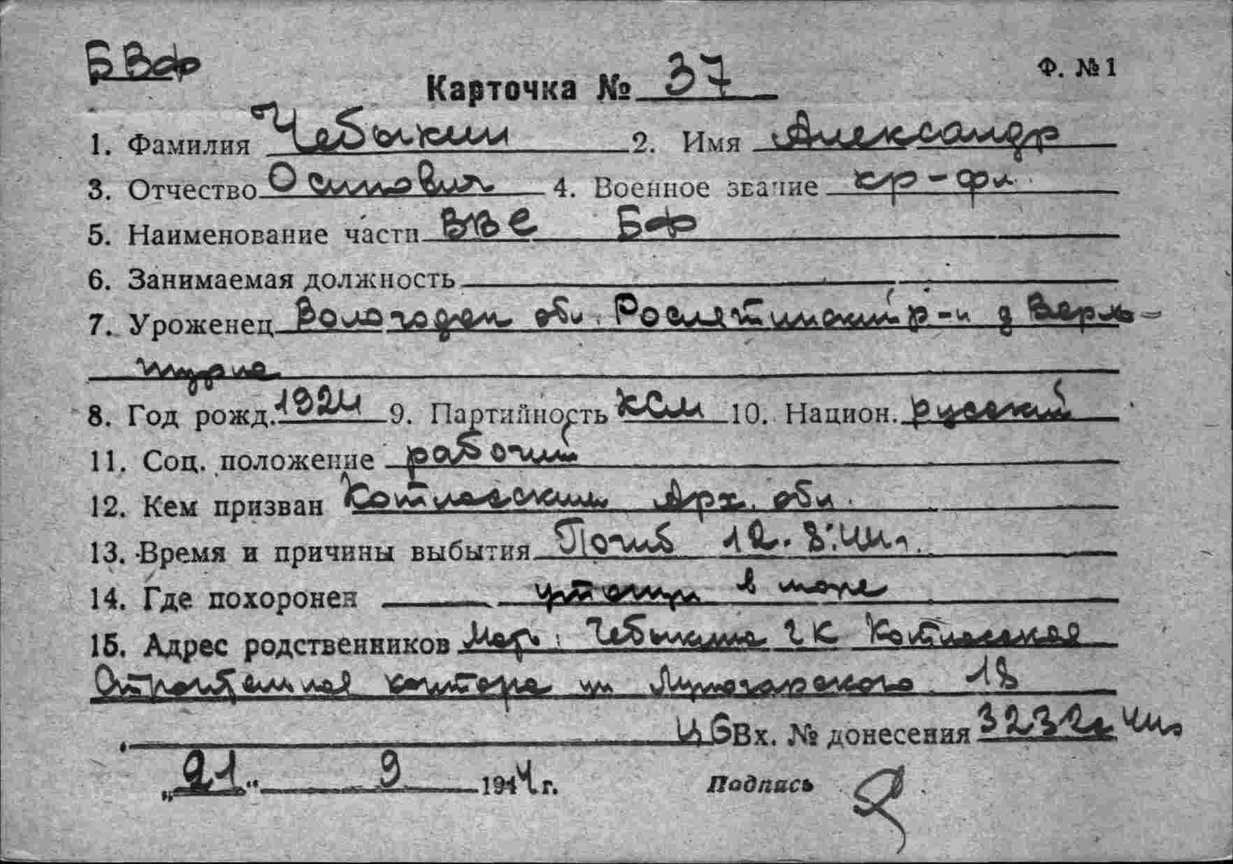 2. ЦВМА ф.12 оп.5 д.222 :Список безвозвратных потерь офицерского состава частей ВВС СФ и ВВС ГФ. Штаб ВВС СФ, ОКОС № 02127 от 22.09. (частично, только по БД-5).