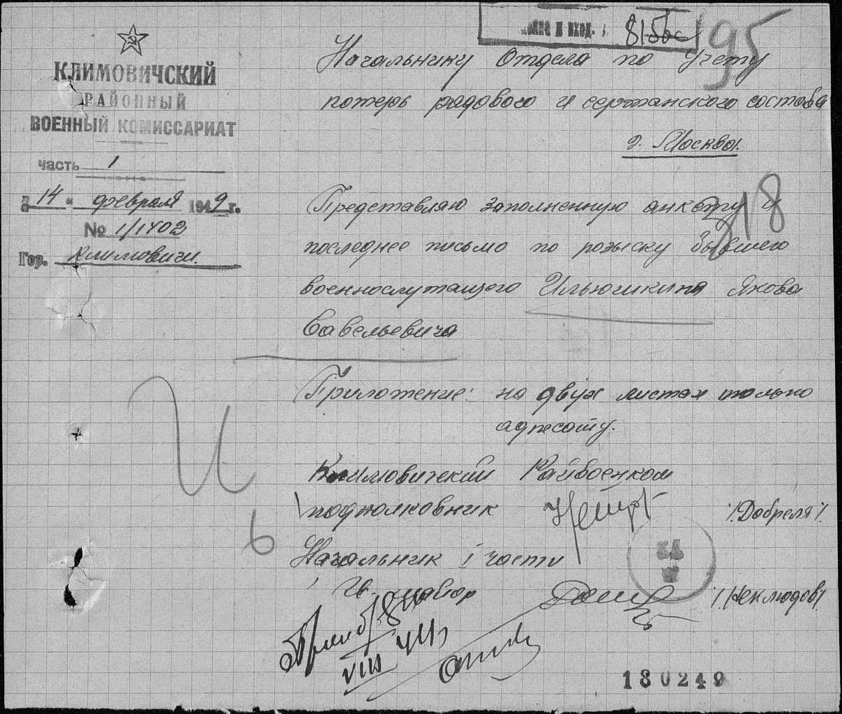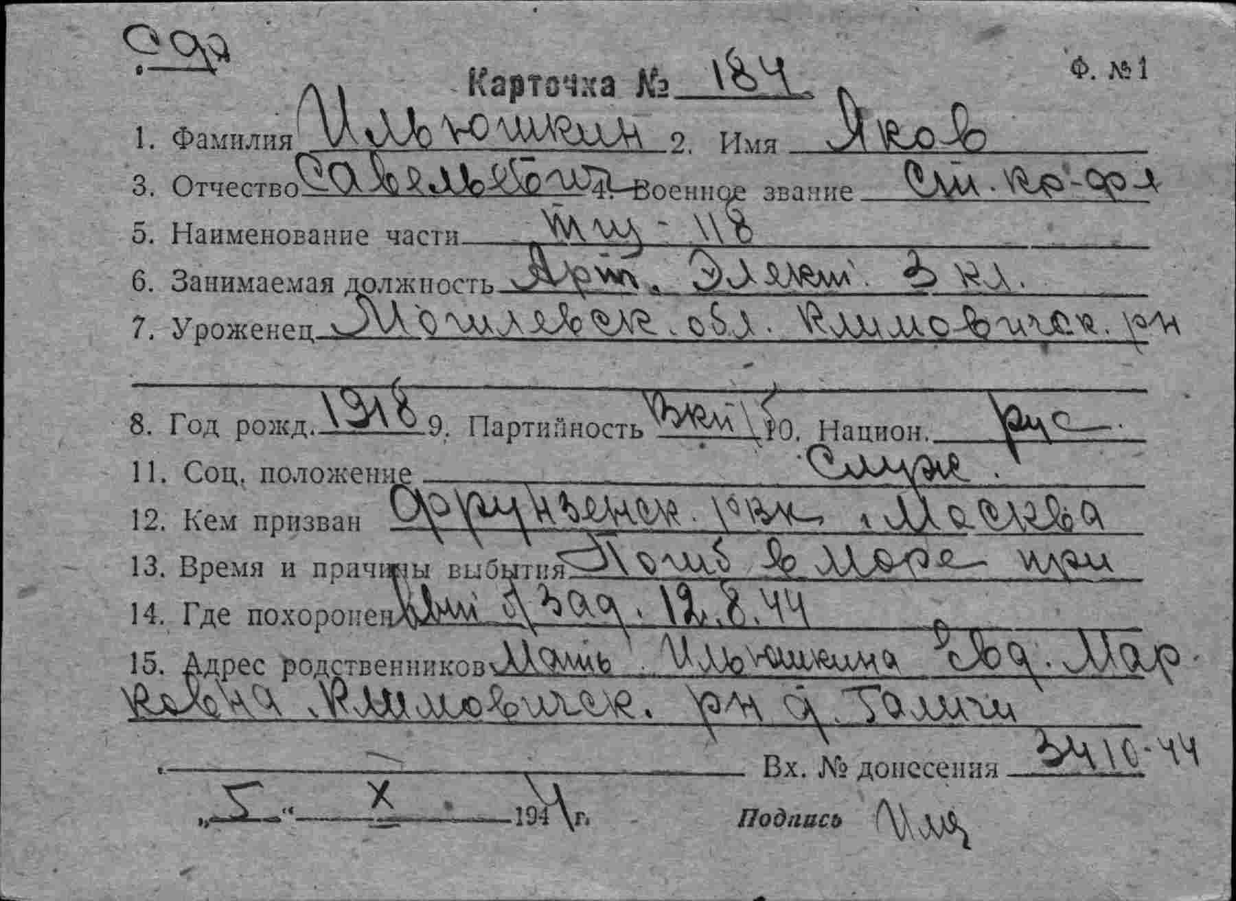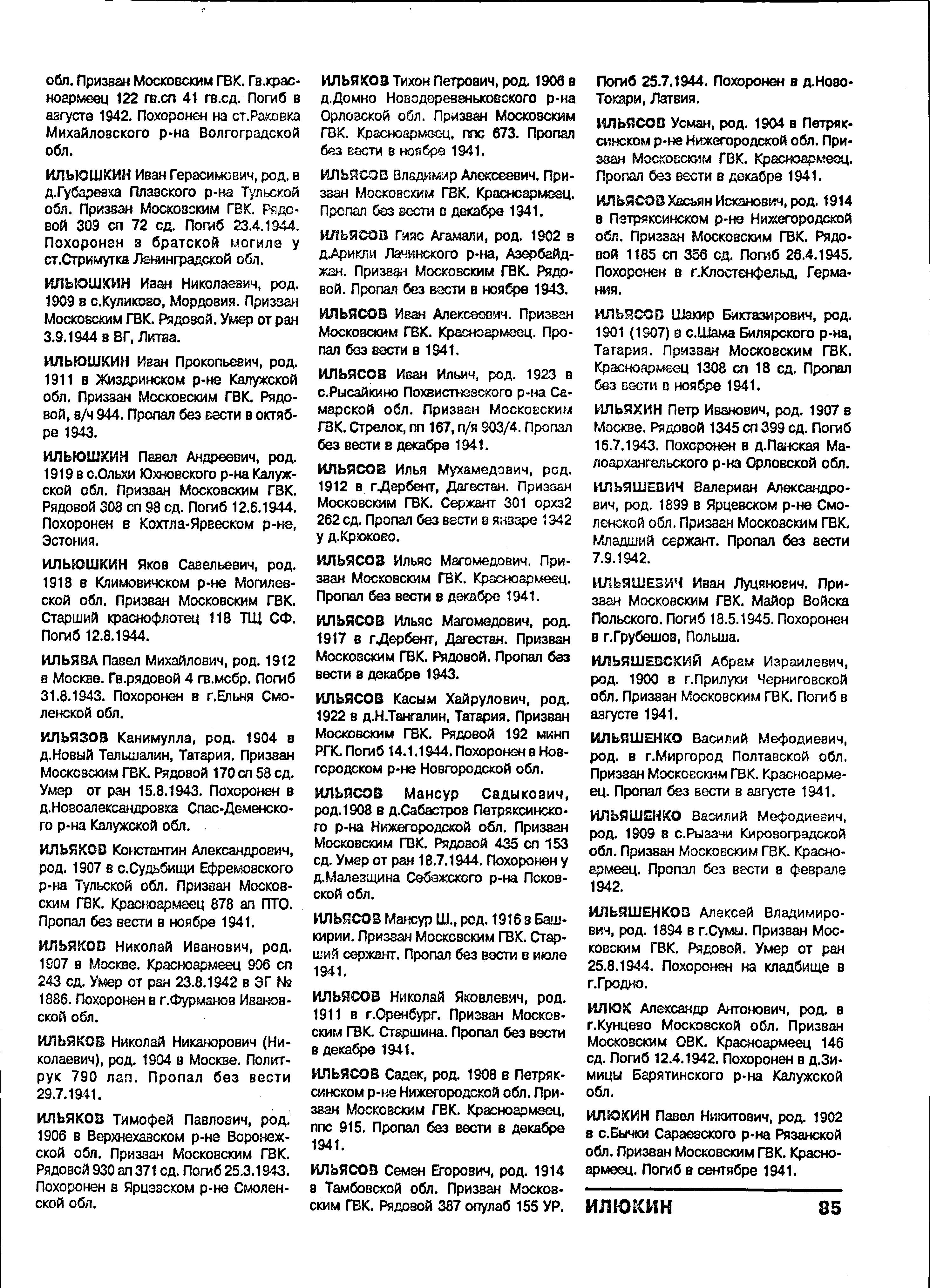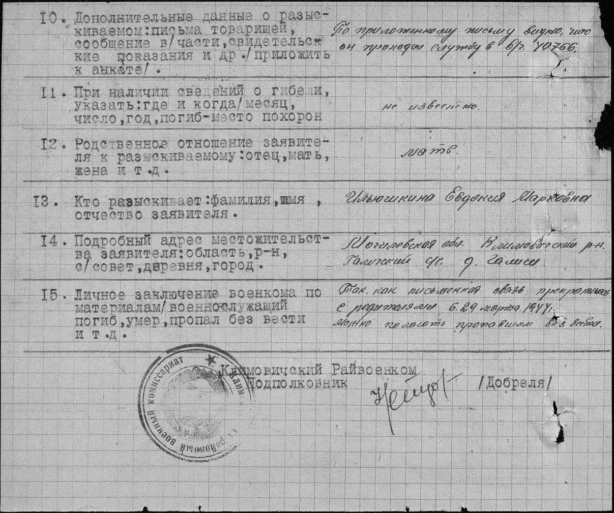 80. Ильюшкин Яков Савельевич, дата рождения – 1917 г.; место рождения – Белорусская ССР, Могилевская обл., Климовичский р-н, Галичский с/с, д. Галичи; дата и место призыва – 1938 г., Фрунзенский РВК, Московская обл., г. Москва, Фрунзенский р-н; последнее место службы – п/п 40766; воинское звание – рядовой; причина выбытия – пропал без вести; дата выбытия – не ранее 29.03.1944; родственники – мама - Ильюшкина Евдокия Марковна; где проживают родственники (подробный адрес) – Могилевская обл., Климовичский р-н, Галичский с/с, д. Галичи; архив – ЦАМО; номер фонда – 58; номер описи – 977522; номер дела – 90.