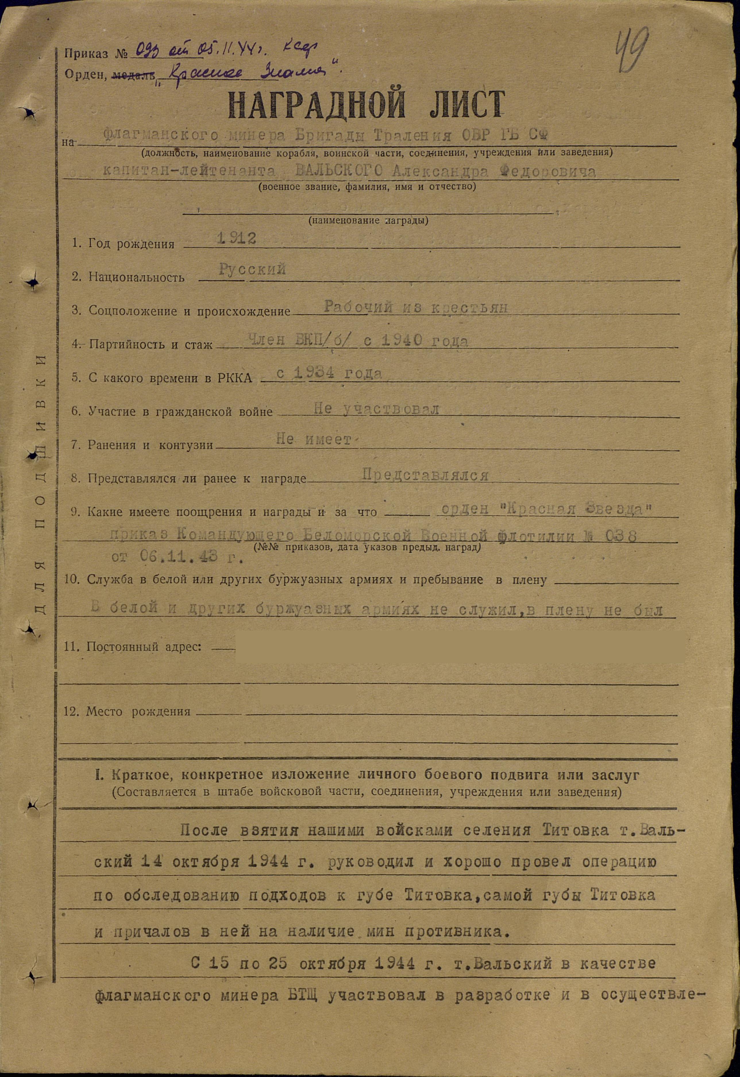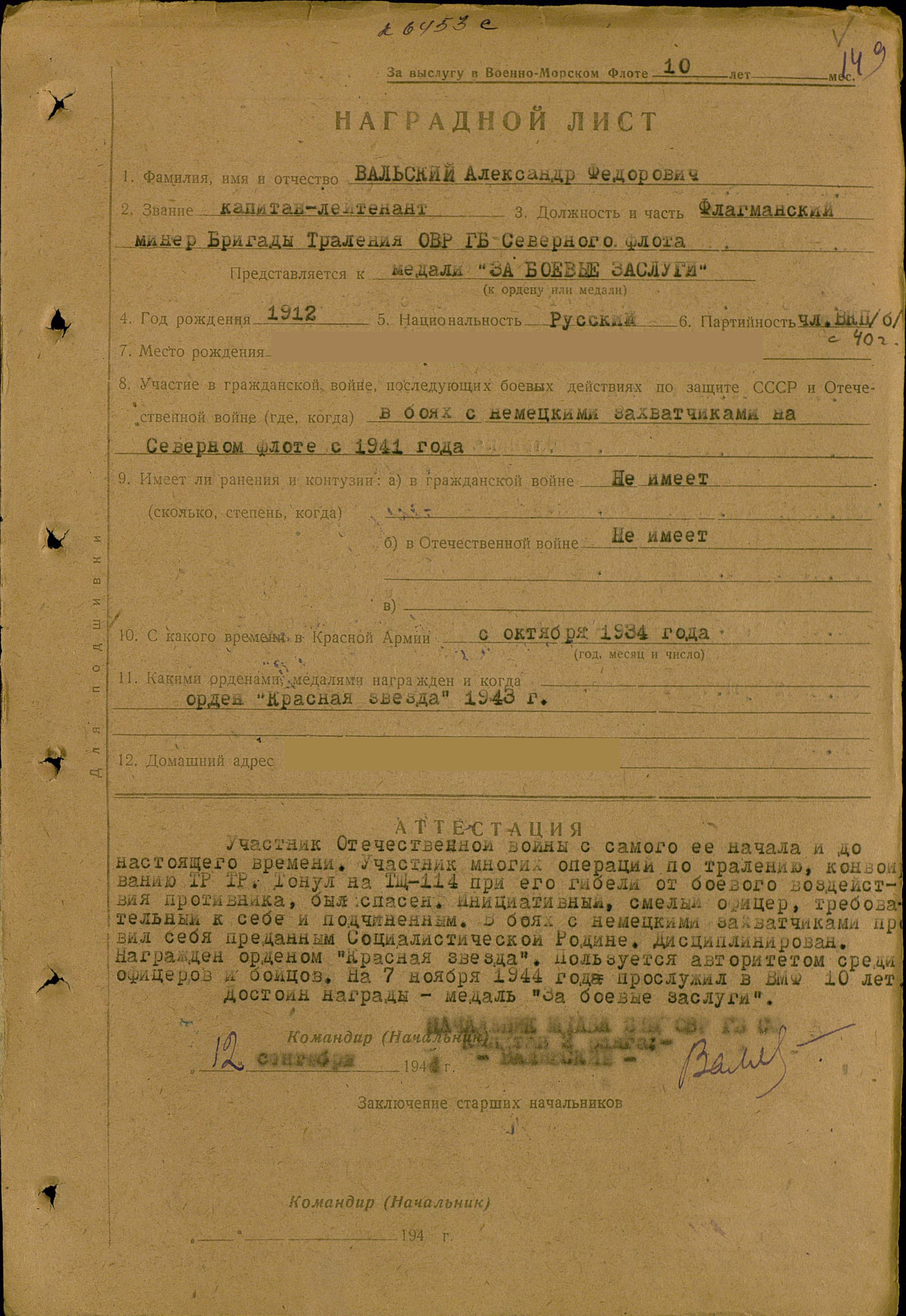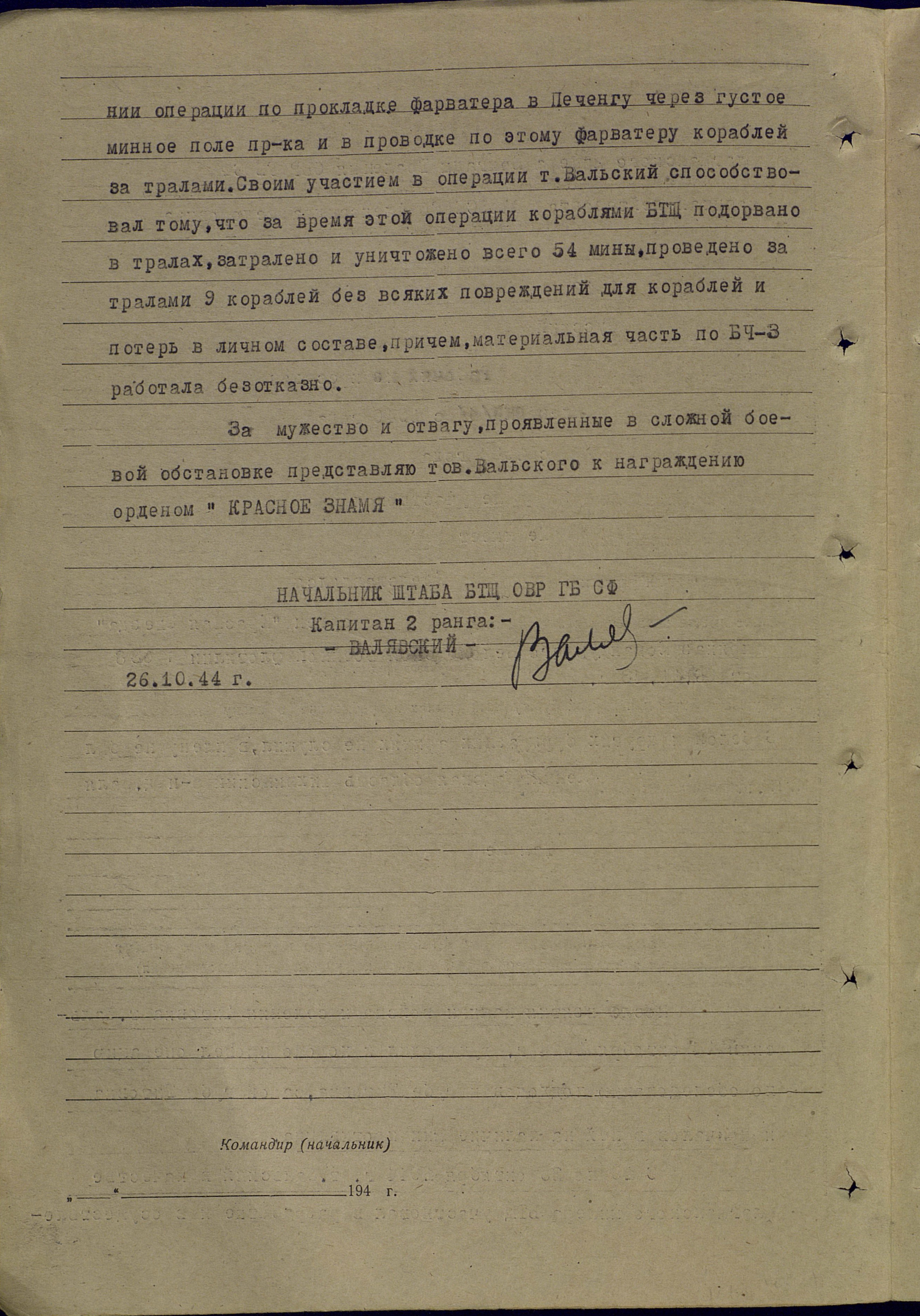 За отличную организацию боевой подготовки личного состава, за обеспечение успешного выполнения боевых заданий по тралению морских коммуникаций от вражеских мин, за проявленные при этом мужество и находчивость ходатайствую о награждении тов. Вальского А.Ф. орденом Красной звезды.