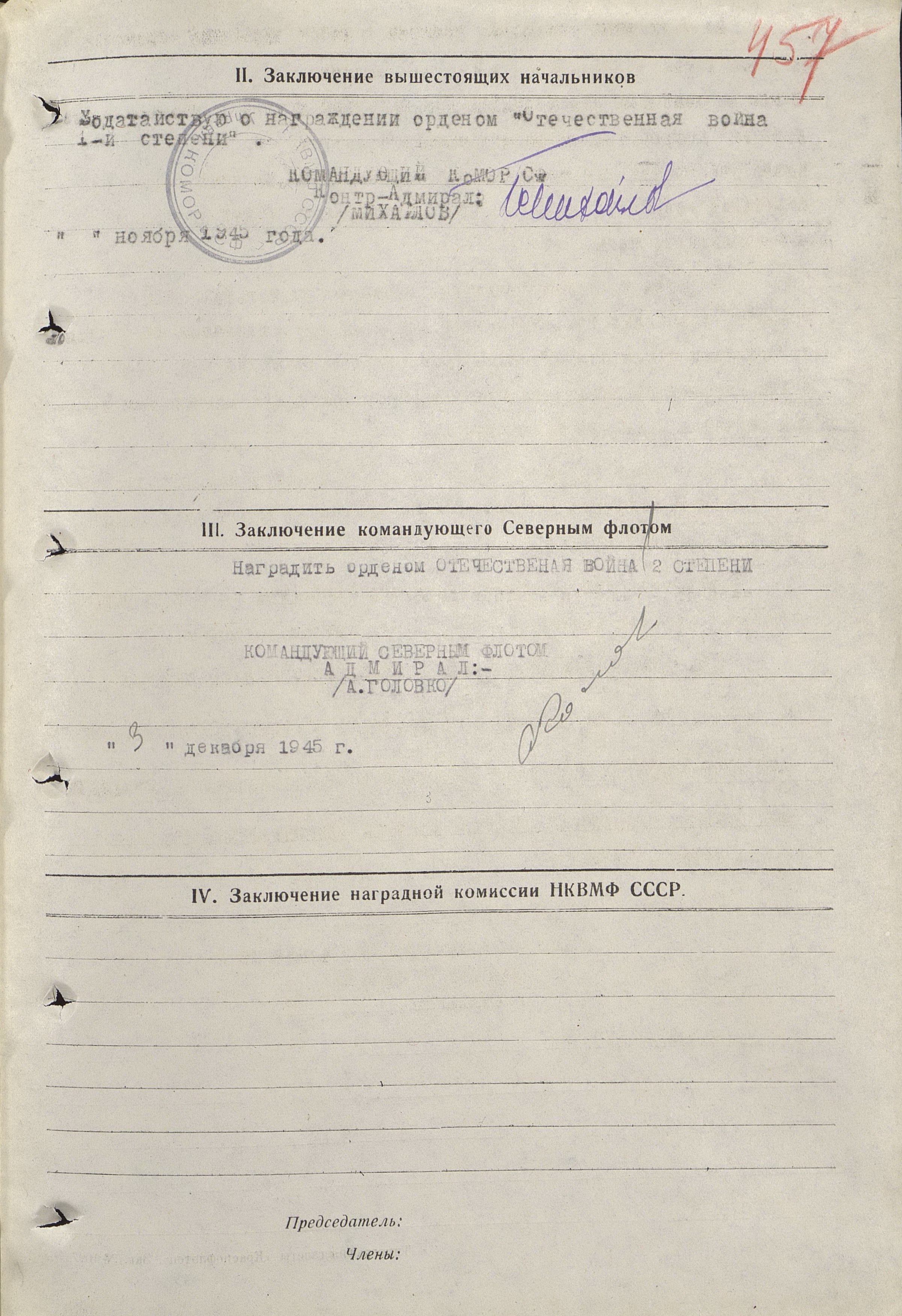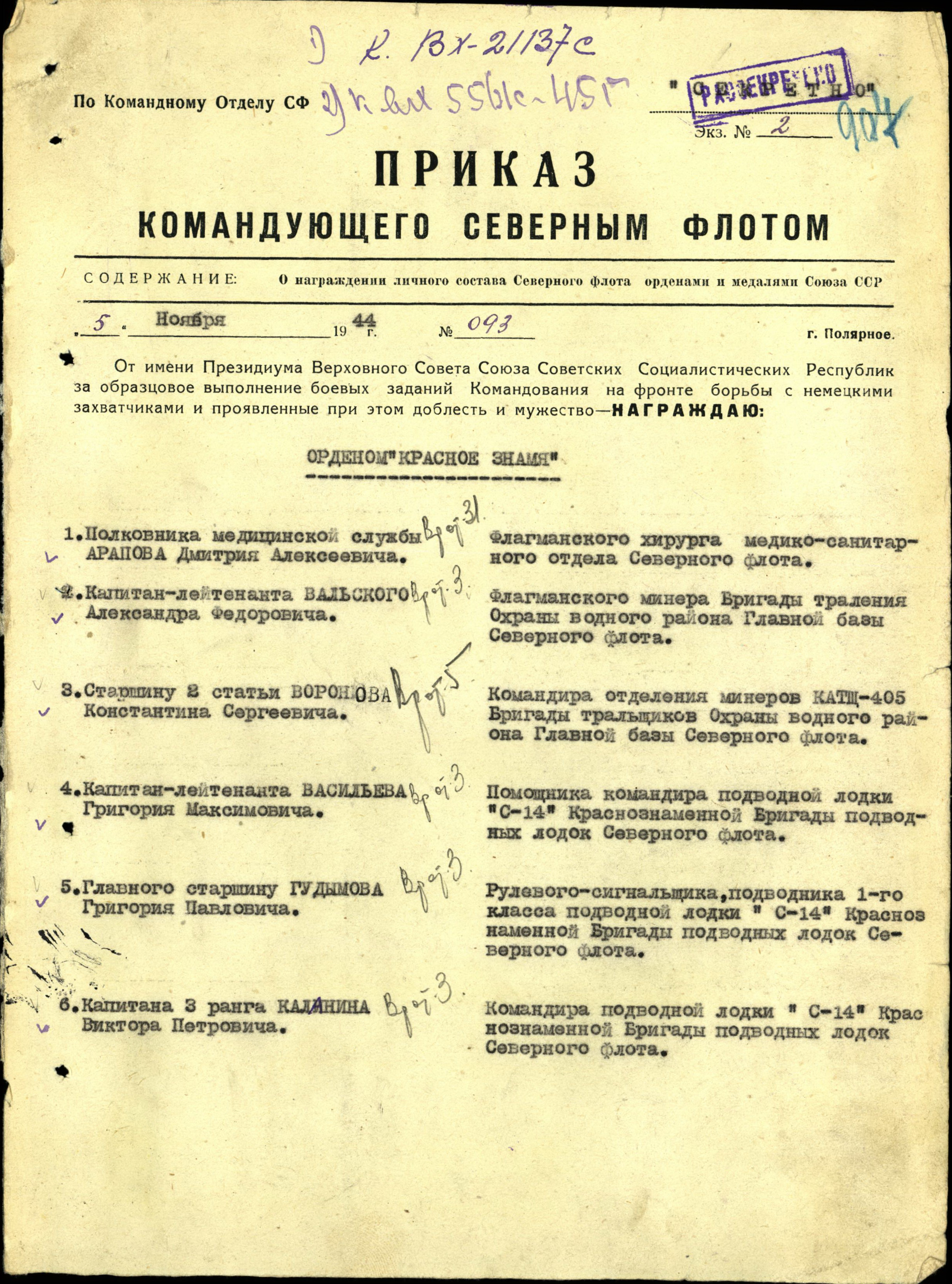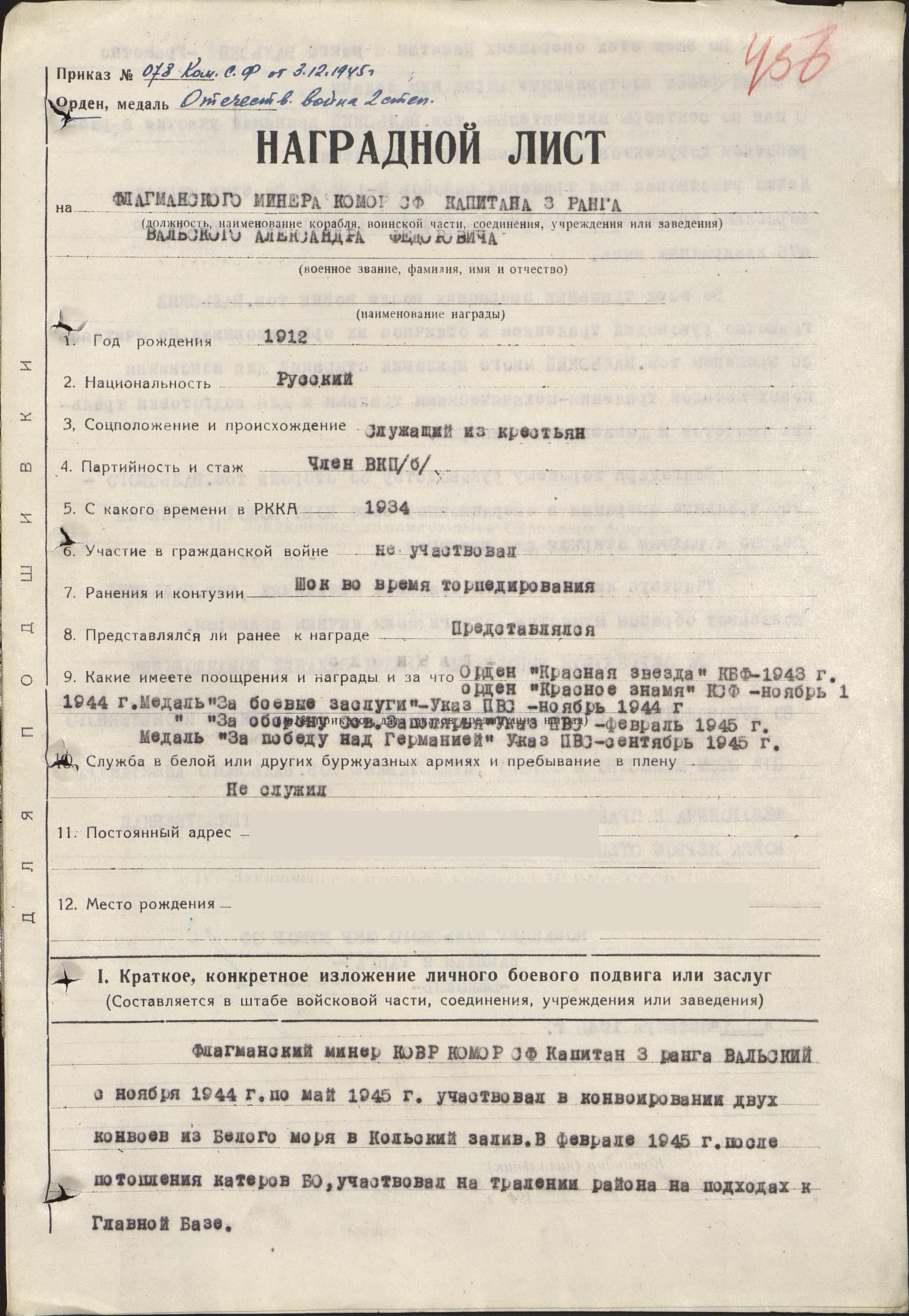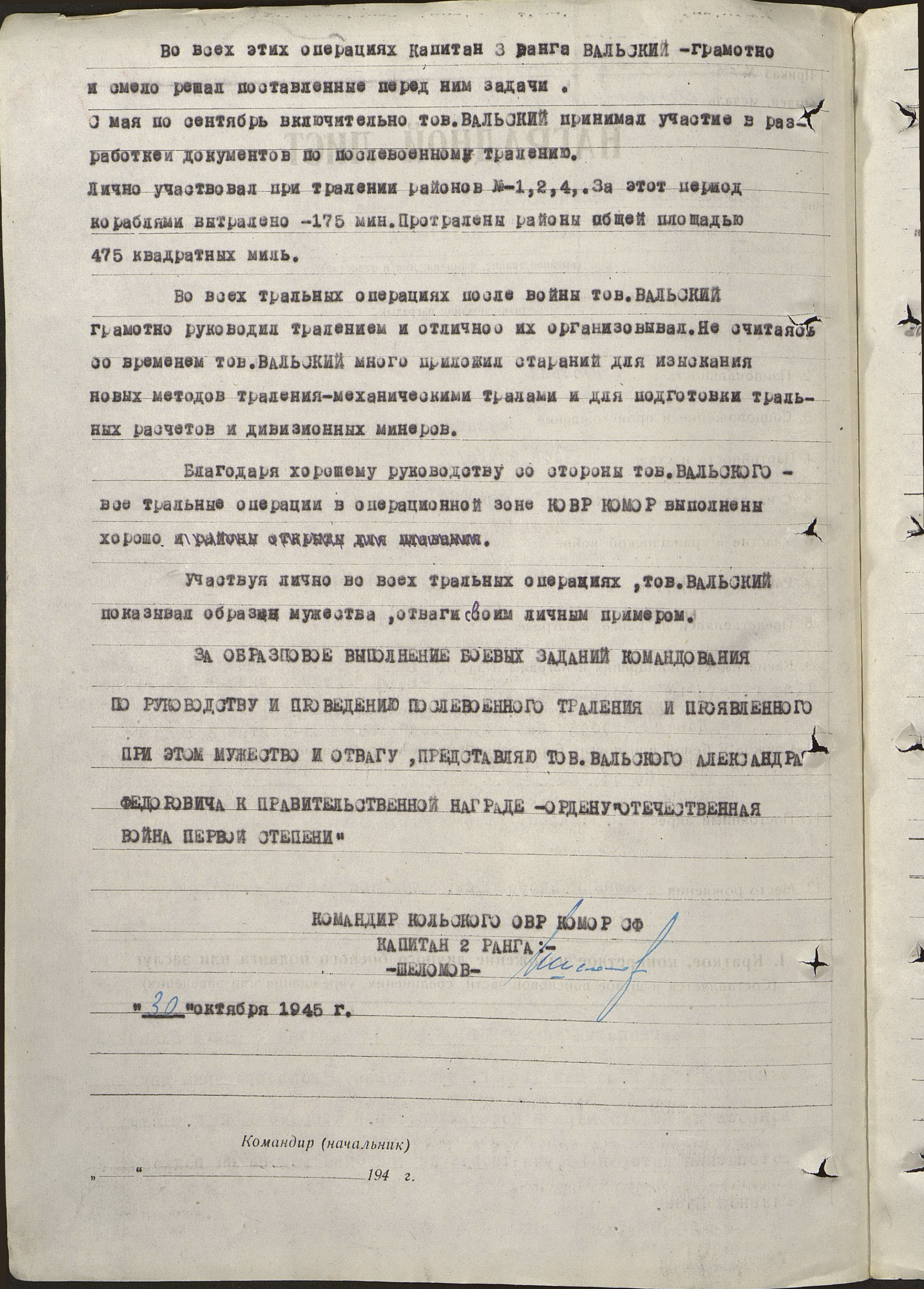 За образцовое выполнение боевых заданий командования по руководству и проведению послевоенного траления и проявленные при этом мужество и отвагу представляю тов. Вальского Александра Федоровича к правительственной награде – ордену Отечественной войны I степени.