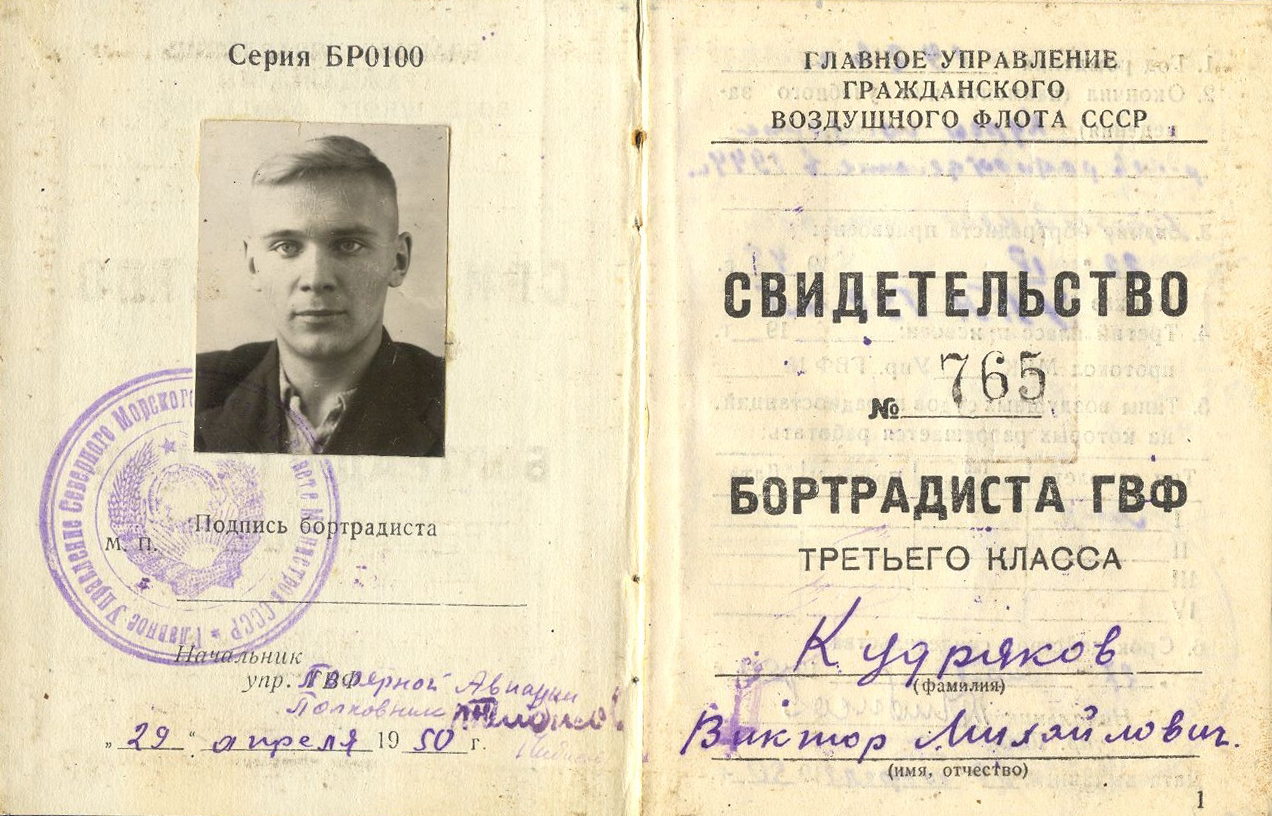 Кудряков Виктор Михайлович с 1944 года работал радистом на полярных станциях Мыс Шалаурова, Тикси и др. (точно не знаю на каких). С 1948 года его перевели в полярную авиацию как опытного радиста. Узнала из книги Саввы Морозова *Они принесли крылья в Арктику", что должность штатного радиста была введена в авиации в 1938 году. до этого летали по картам - это осложняло полеты. Из той же книги узнала, какой необыкновенный человек был полярный летчик Матвей Ильич Козлов. там есть его рассказ о том, что в день его рождения 12 аавгуста с ним почти всегда происходили невероятные случаи. Также было и в 1944 году в Карском море.
