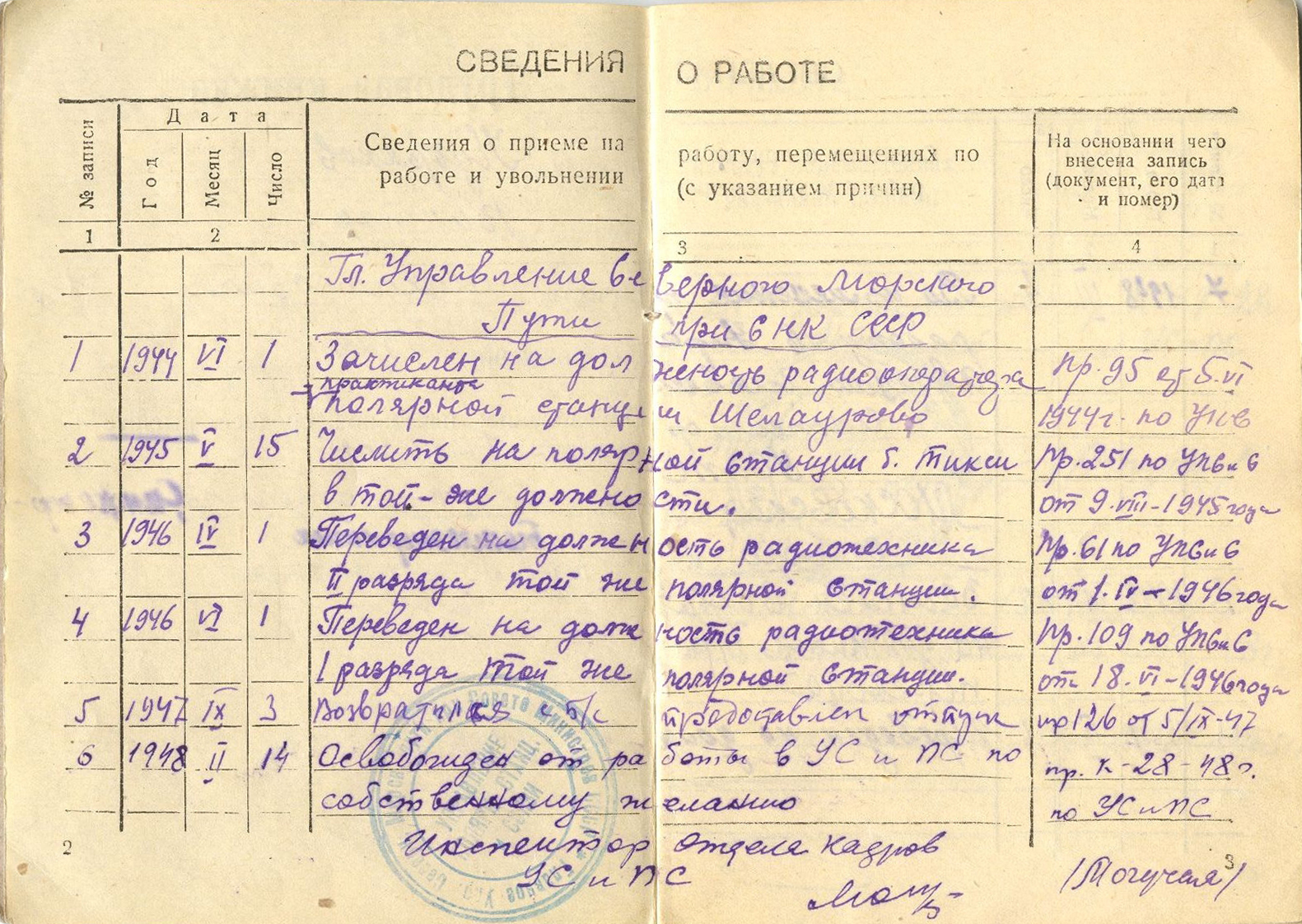 Это первая страница трудовой книжки Кудрякова В.М. Там написано, что 1-го апреля 1944 года он работает радистом-учеником на станции мыс Шалаурова. 15 мая 1945 года переведен на полярную станцию Бухты Тикси.