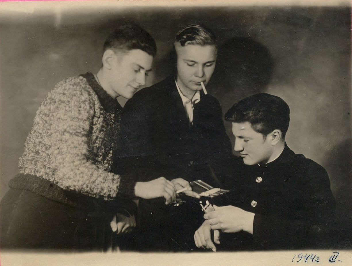 В середине - мой отец (блондин), а кто остальные двое – к сожалению не знаю. Двое молодых людей – это товарищи Кудрякова В.М. по курсам полярных радистов. Там подпись «март 1944 года», это уже они почти выучились. Мои предположения: Владимир Пупынин, Курский Анатолий, Лев Гарцев. Они есть в общем поисковом списке участников конвоя.