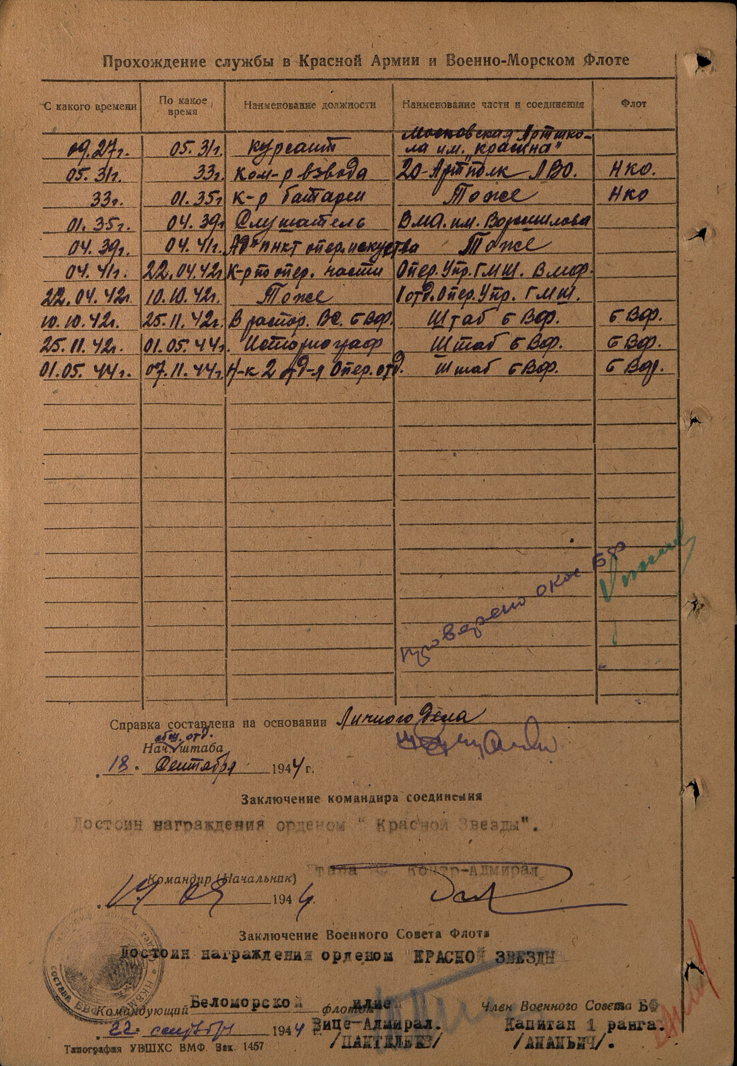 В 1927 г поступил в Московское артиллерийское училище им. Красина, после окончания которого в 1931 г., служил командиром взвода и командиром батареи 20-ого артполка в г. Ленинграде. В 1935–1939 гг. – слушатель Военно-морской академии им. Варашилова в г. Ленинграде, а в 1939– 941 гг. – адъюнкт этой академии. В Великую Отечественную войну вступил в качестве командира оперативной части оперативного управления Главного Морского штаба, г. Москва (1941–42 гг.) В 1942-45 гг. на Северном флоте на должностях от старшего офицера оперативного отделения штаба Беломорского морского района до начальника оперативного отделения Беломорской военной флотилии (г. Архангельск).