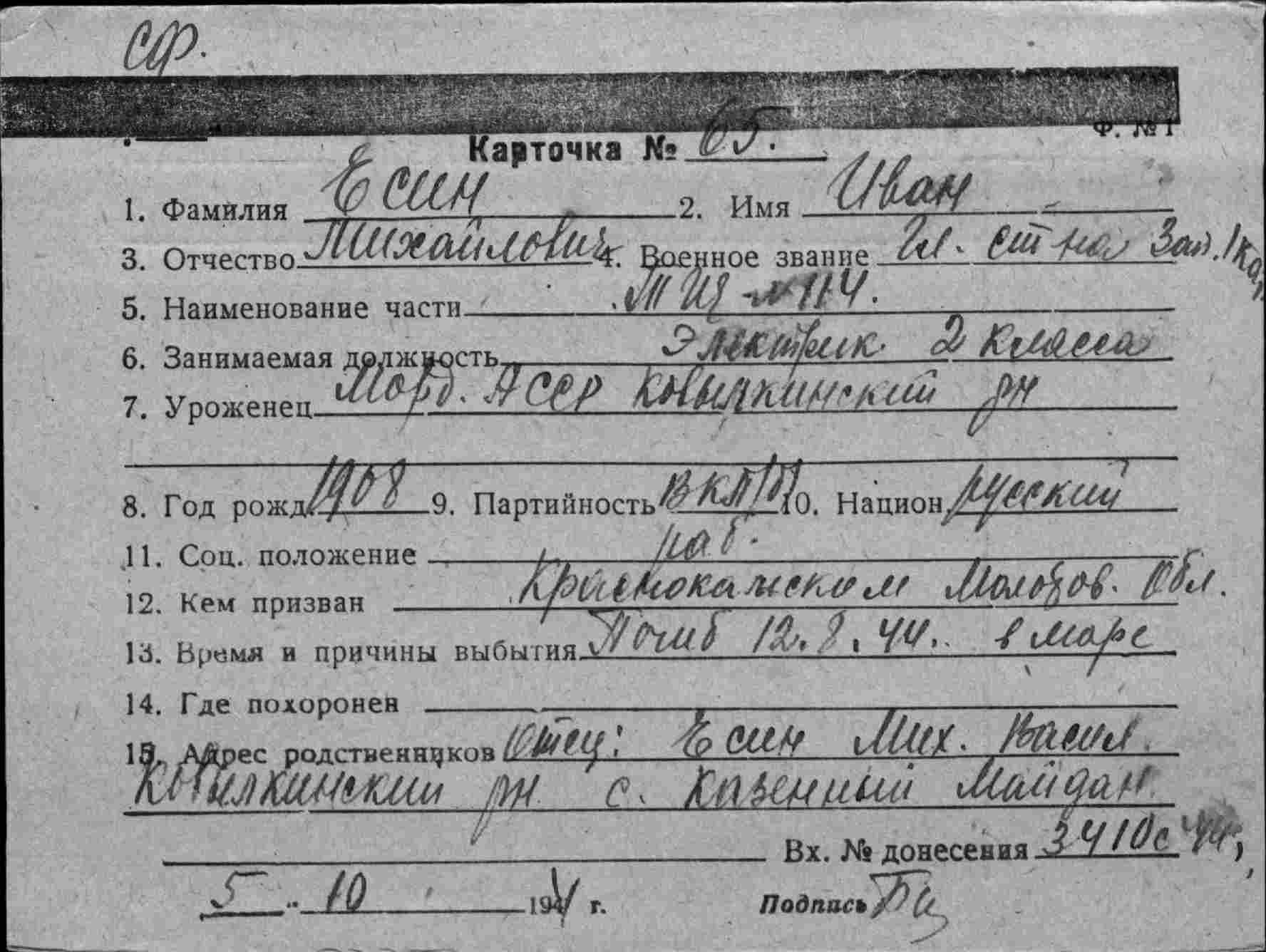 Есин Иван Михайлович, 1908 года рождения. Уроженец с. Казенный Майдан Ковылкинского района Мордовской АССР. Отец – Михаил Васильевич Есин. Гвардии старшина. Электрик 2 класса, главный старшина минного тральщика ТЩ-114. Призван Краснокамским ГВК Молотовской (ныне – Пермской) области. Член ВКП (б). Погиб 12 августа 1944 года в Карском море при выполнении боевого задания.