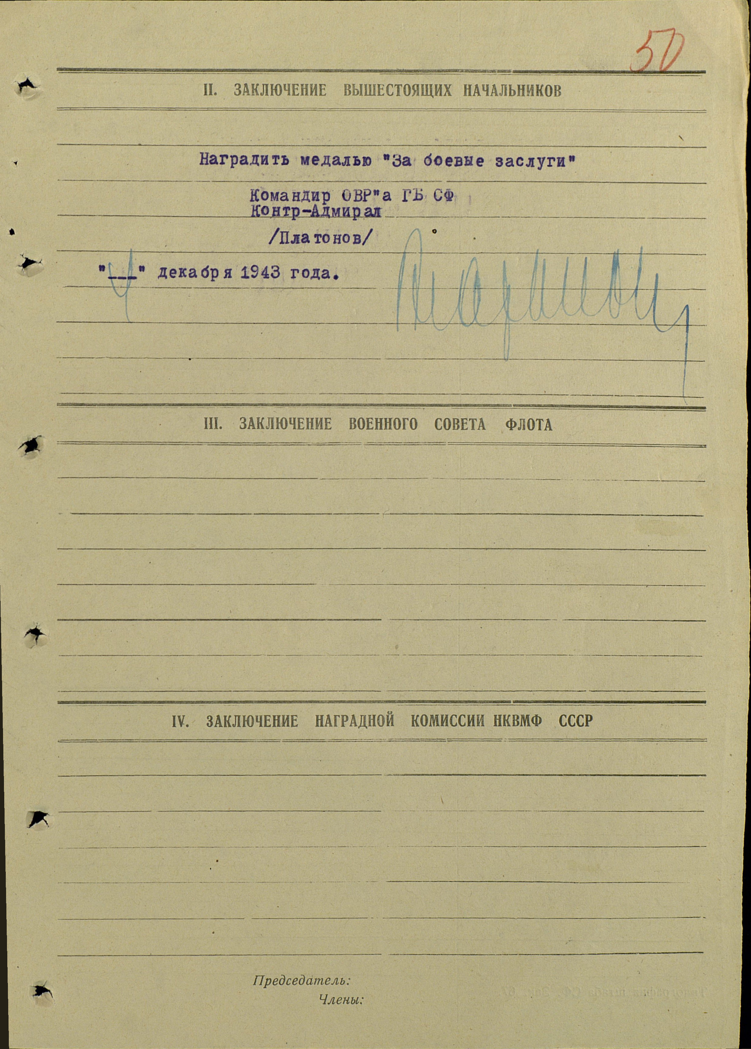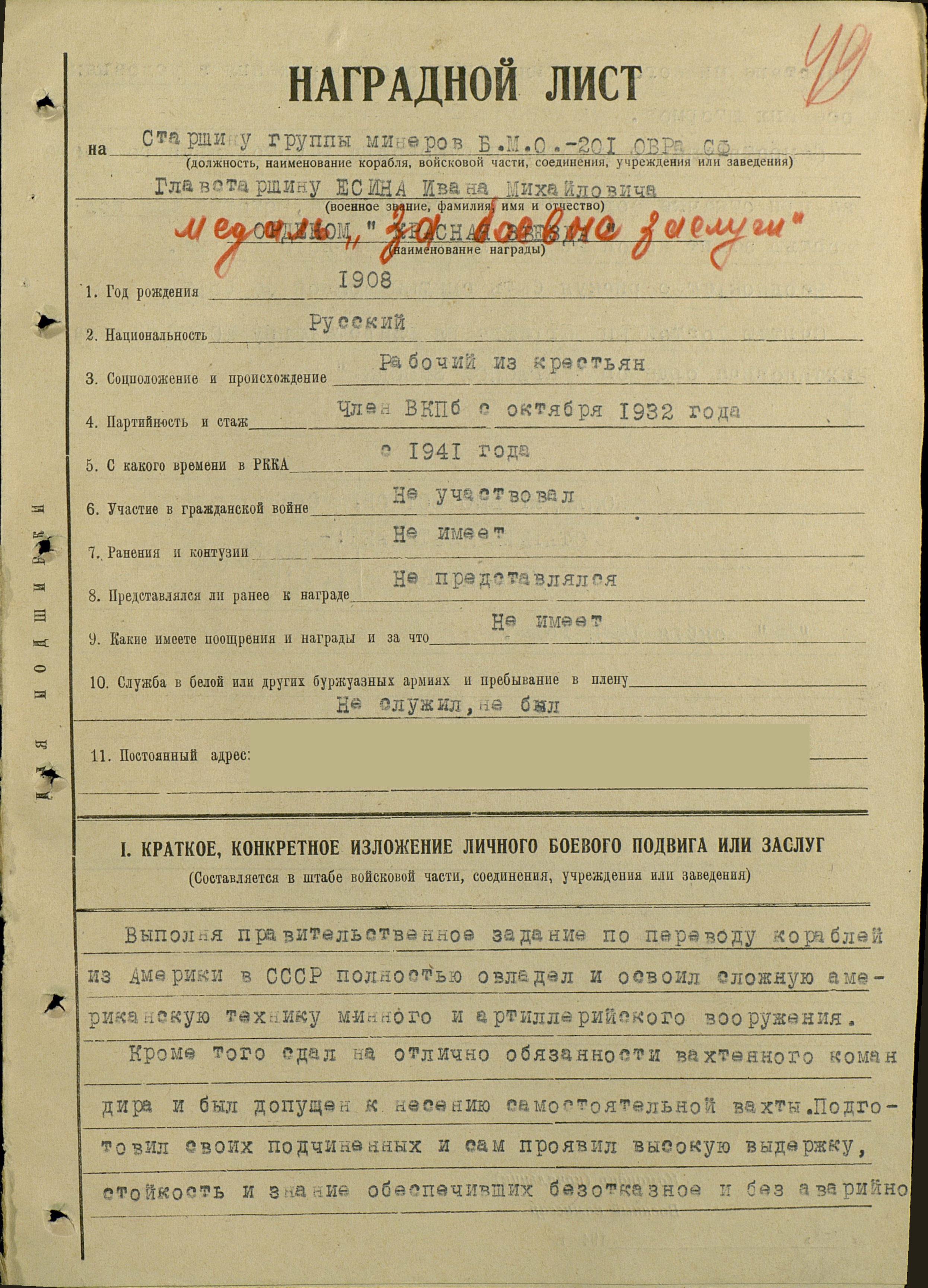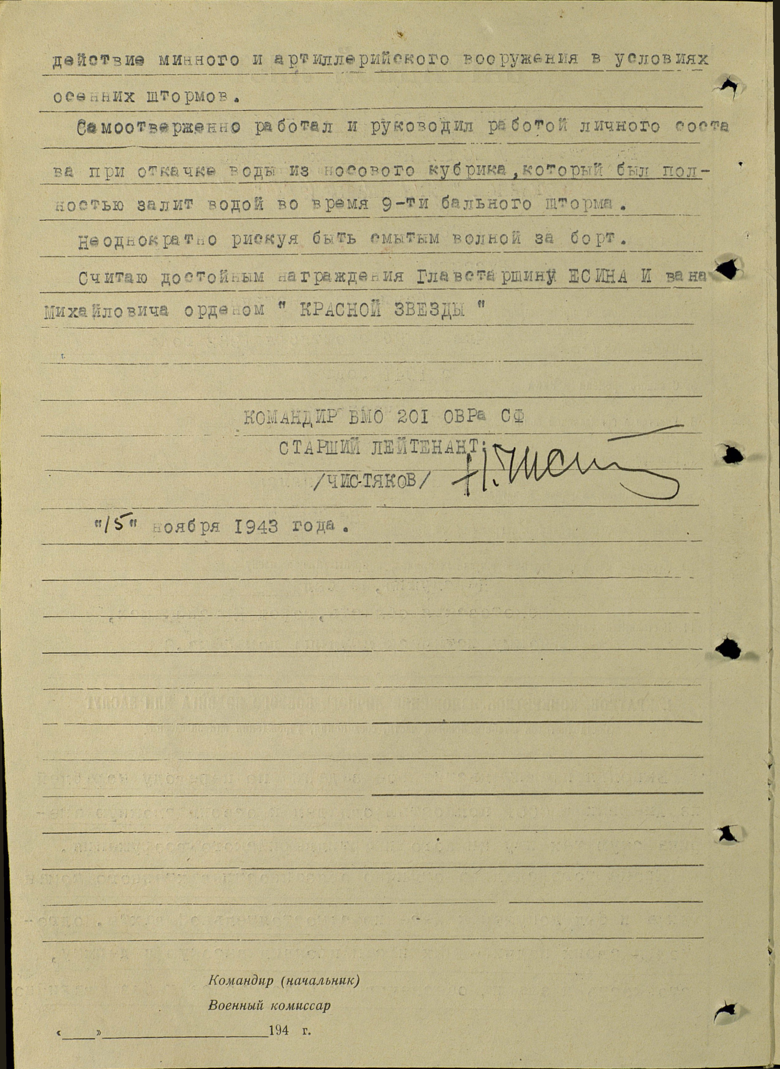 Считаю достойным награждения главстаршину Есина Ивана Михайловича орденом Красной Звезды.